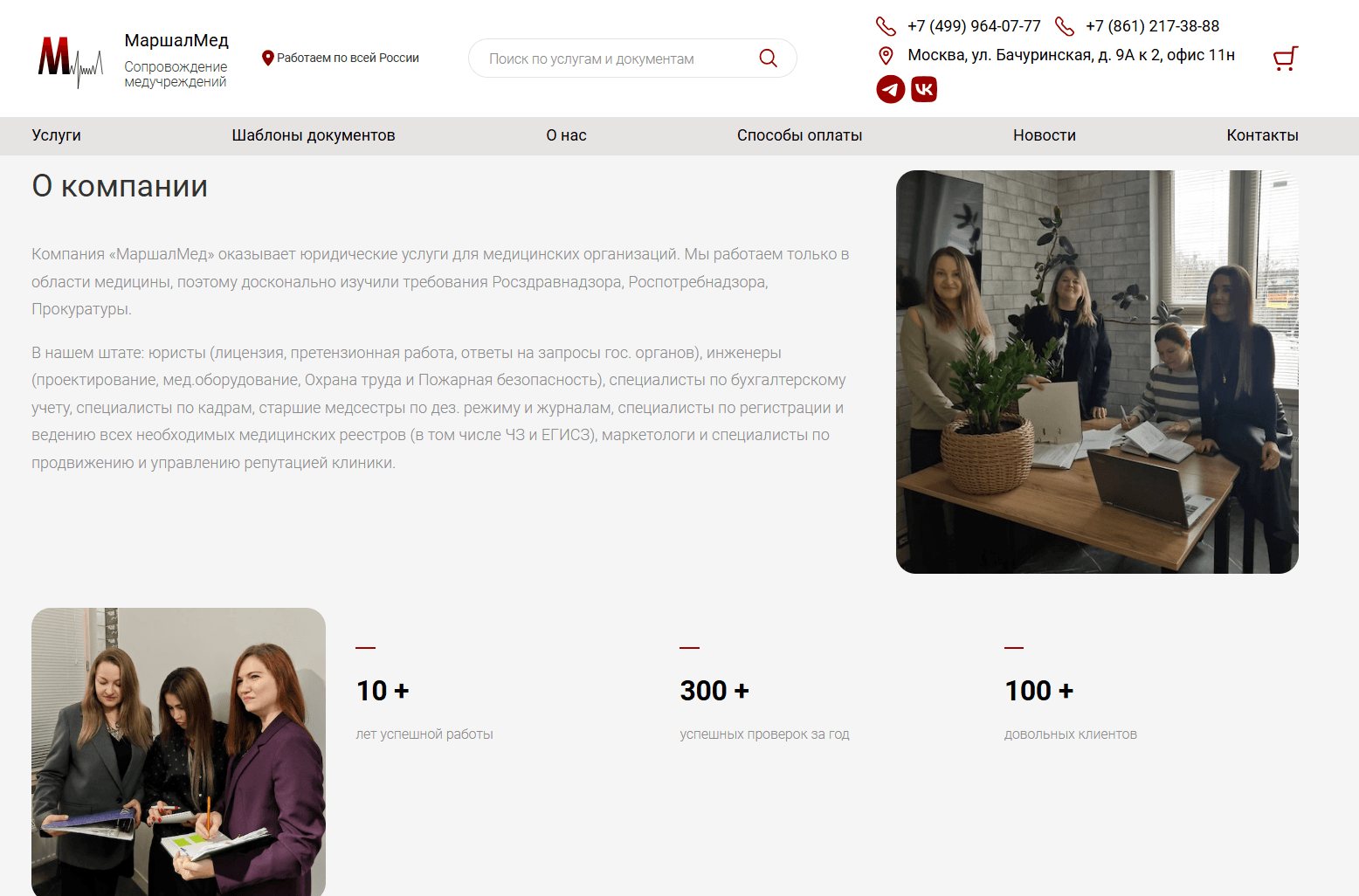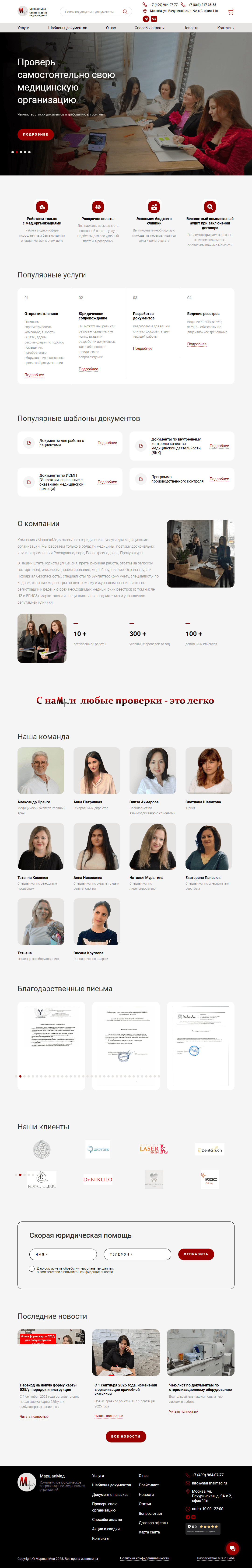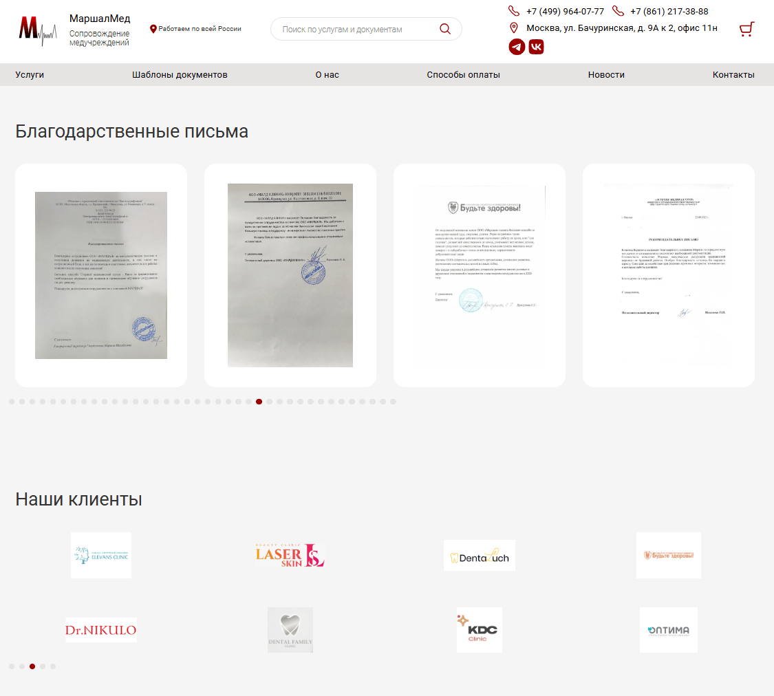 Сайт компании, которая оказывает юридические услуги для медицинских учреждений. Имеет в своем штате не только юристов, но и инженеров, специалистов по бухгалтерскому учету, кадрам, регистрации и ведению всех необходимых медицинских реестров, маркетологов. Кроме того, компания реализует шаблоны документов по медицинской тематике. На сайте представлен весь каталог документов, любой из которых можно добавить в корзину, приобрести, оплатить онлайн.