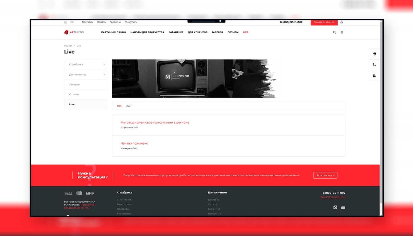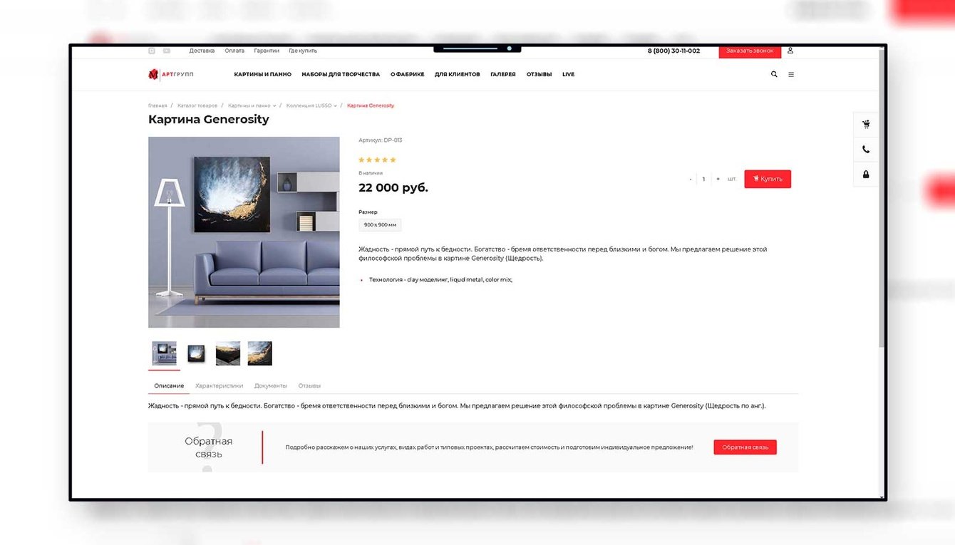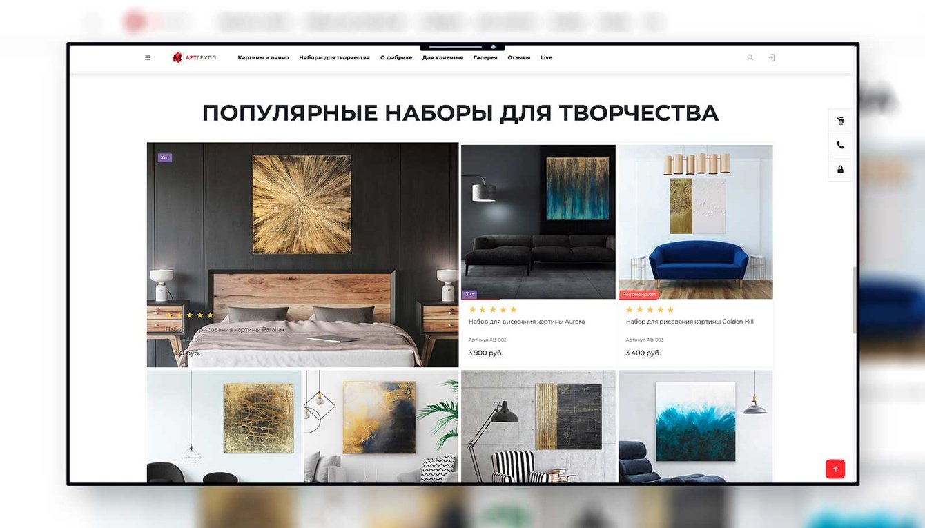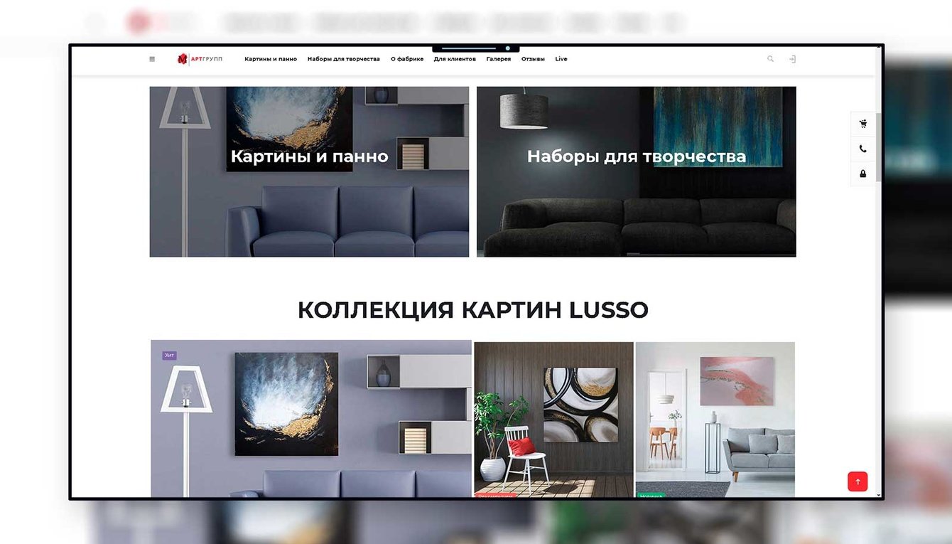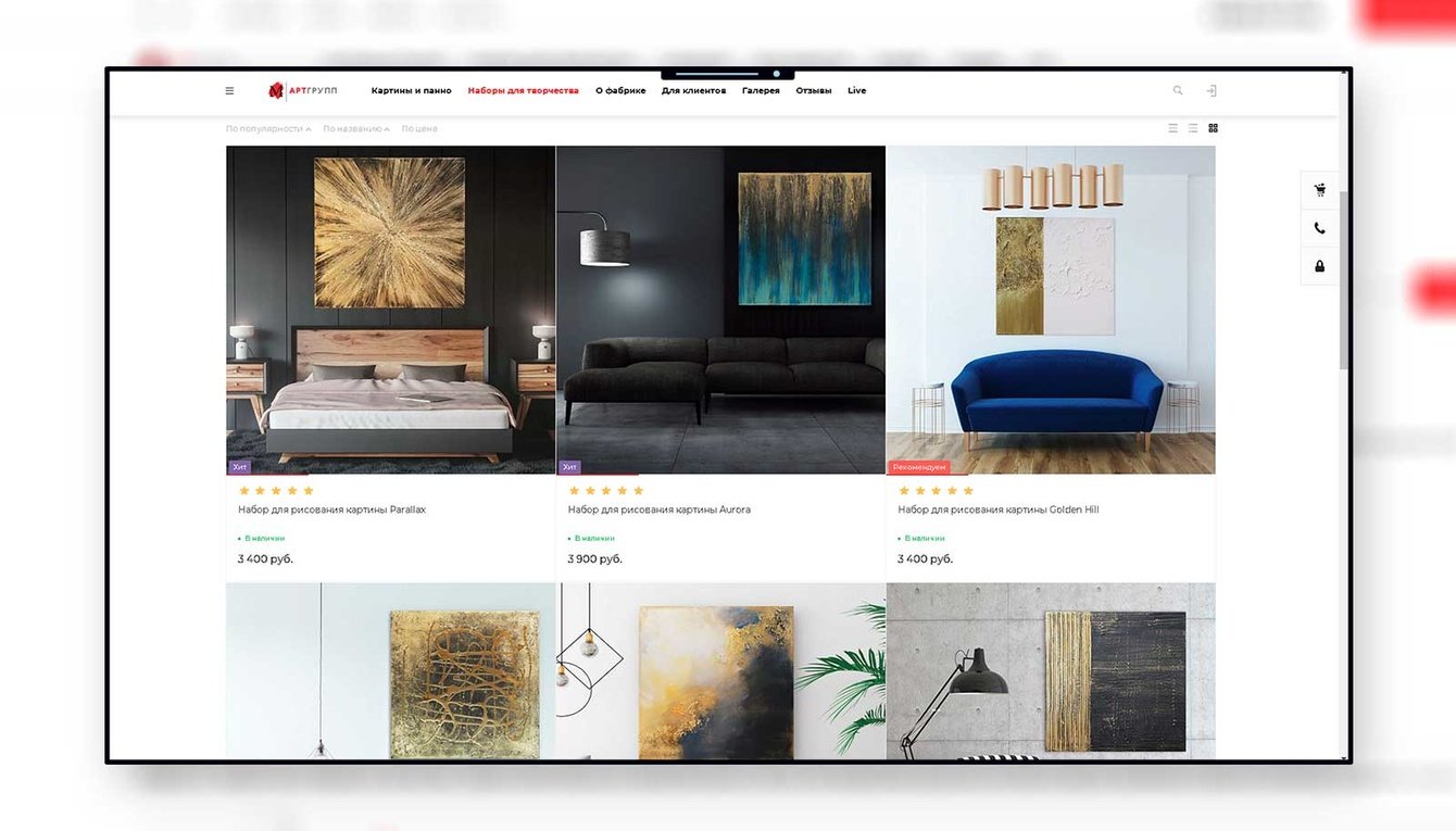 Создание интернет-магазина картин. Найти эффективное решение привлекательного дизайна не отвлекающего от основной функции представления работ галереи работ художников, продумать удобную навигацию по сайту. В систему сайта интегрирован эквайринг "Сбербанка", расчет доставки службой "СДЕК"