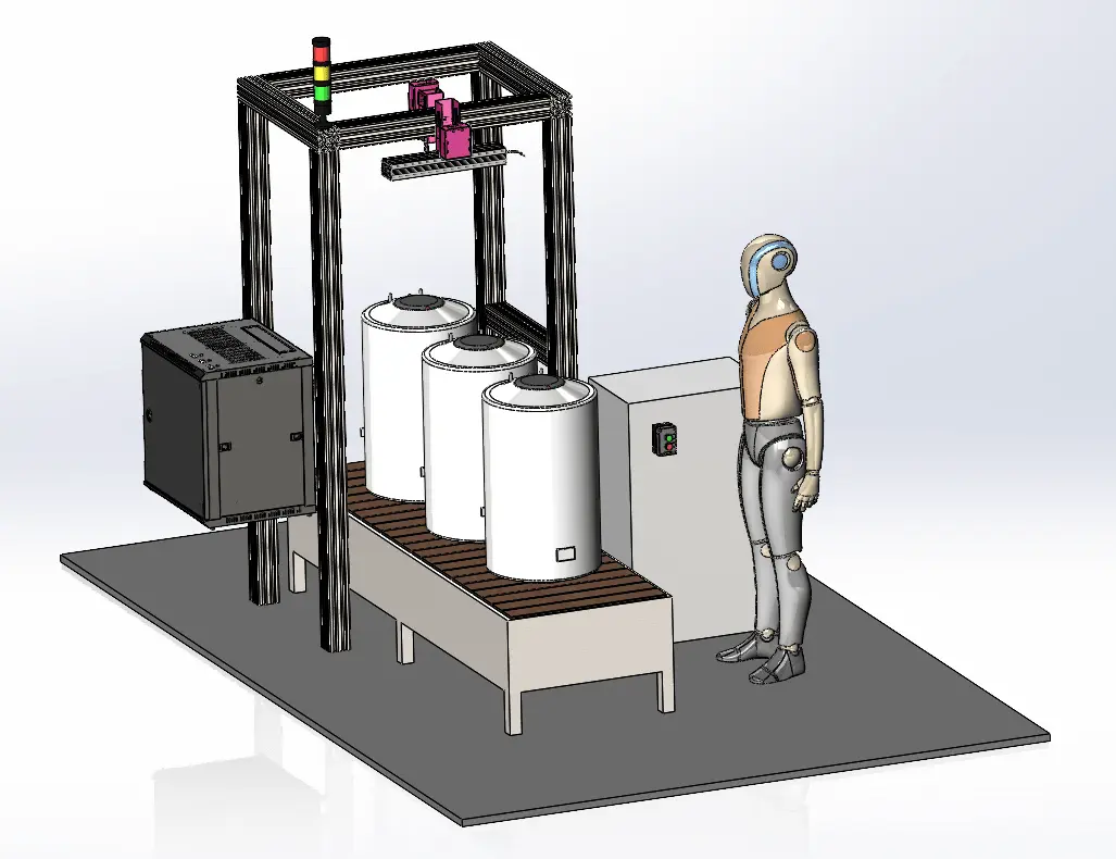 Смоделировали виртуальную 3D сцену на основе замеров с производственной линии. Рассчитали оптимальное расстояние для установки камер, светильника и подготовили чертежи мачты для крепления оборудования, по которым изготовили конструкцию.