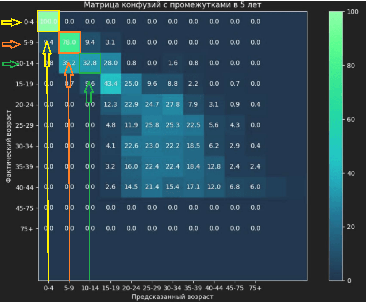 Матрица конфузий наглядна: если число в ячейке близко к 100%, значит модель хорошо определила возрастную группу. Но основная задача была — отсеивать несовершеннолетних и не давать им «18+». И вот некоторые итоги: