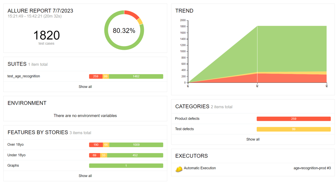 В отчёте Allure можно увидеть, сколько раз нейросеть правильно определила совершеннолетних/несовершеннолетних, а где дала сбой: например, низкое качество фото, несколько лиц на одном снимке, отсутствие человека в кадре.