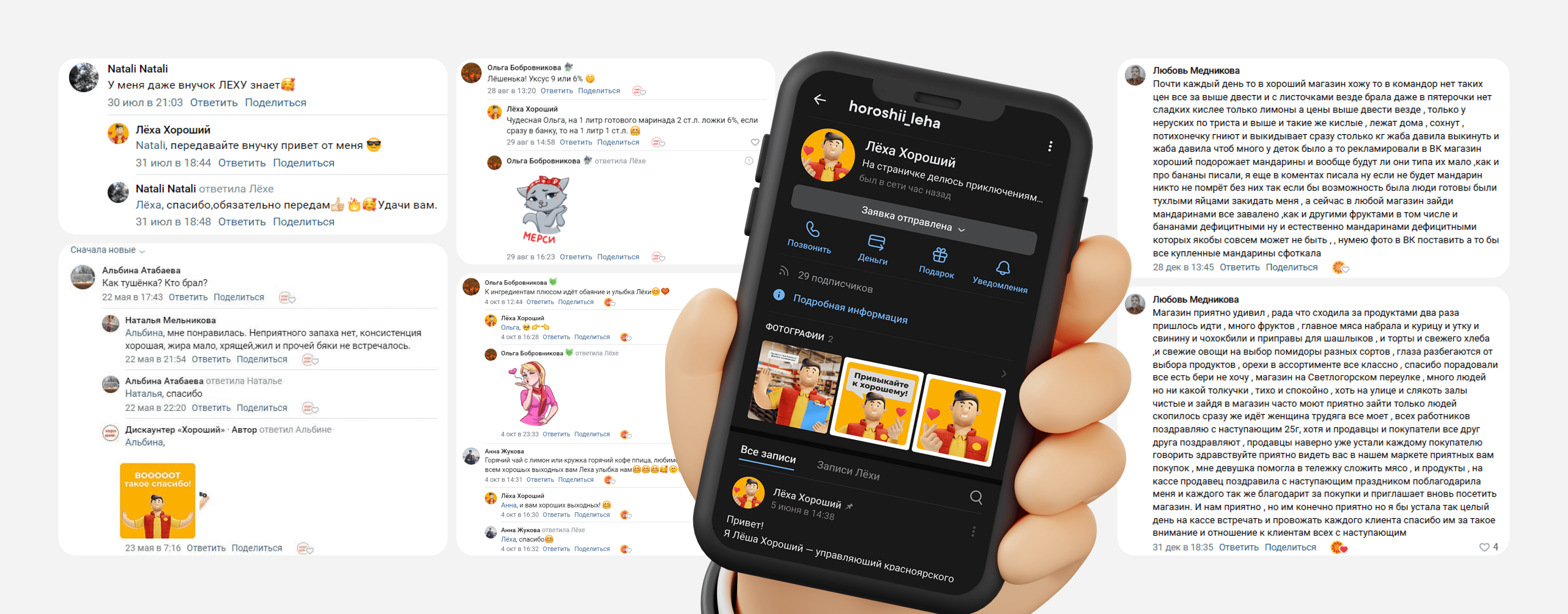 Мы создали личные аккаунты Лёши и оживили их при помощи «личных» постов. Модератор от имени героя не просто отвечал на комментарии в соцсетях компании, но и переходил на страницы комментаторов, ставил лайки и поддерживал общение на их личных страницах.