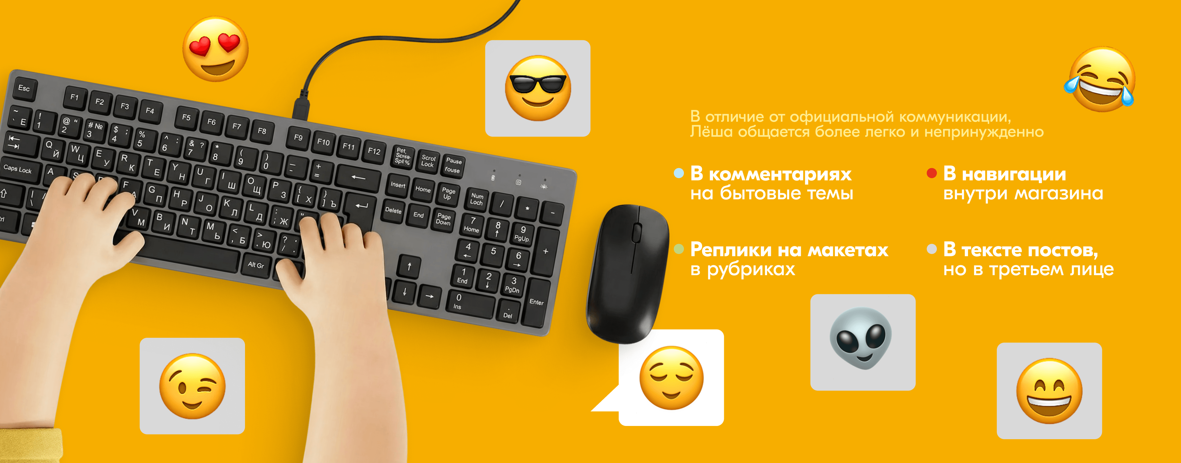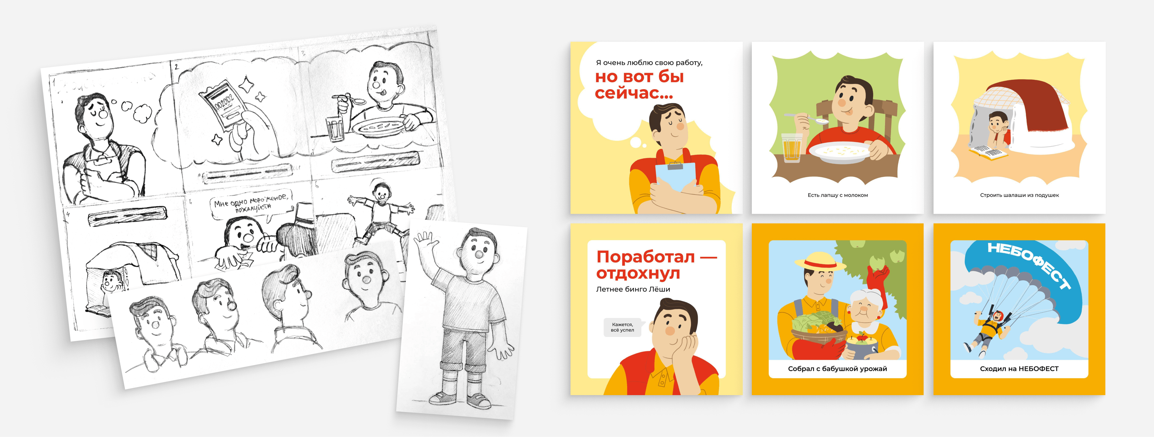 Лёша — не статичный персонаж. Поэтому мы разработали иконографию героя, меняя образ в зависимости от ситуаций, в которых он появляется. А ещё мы не только внедрили героя в коммуникацию с подписчиками, но и включили его образ в продающий контент.