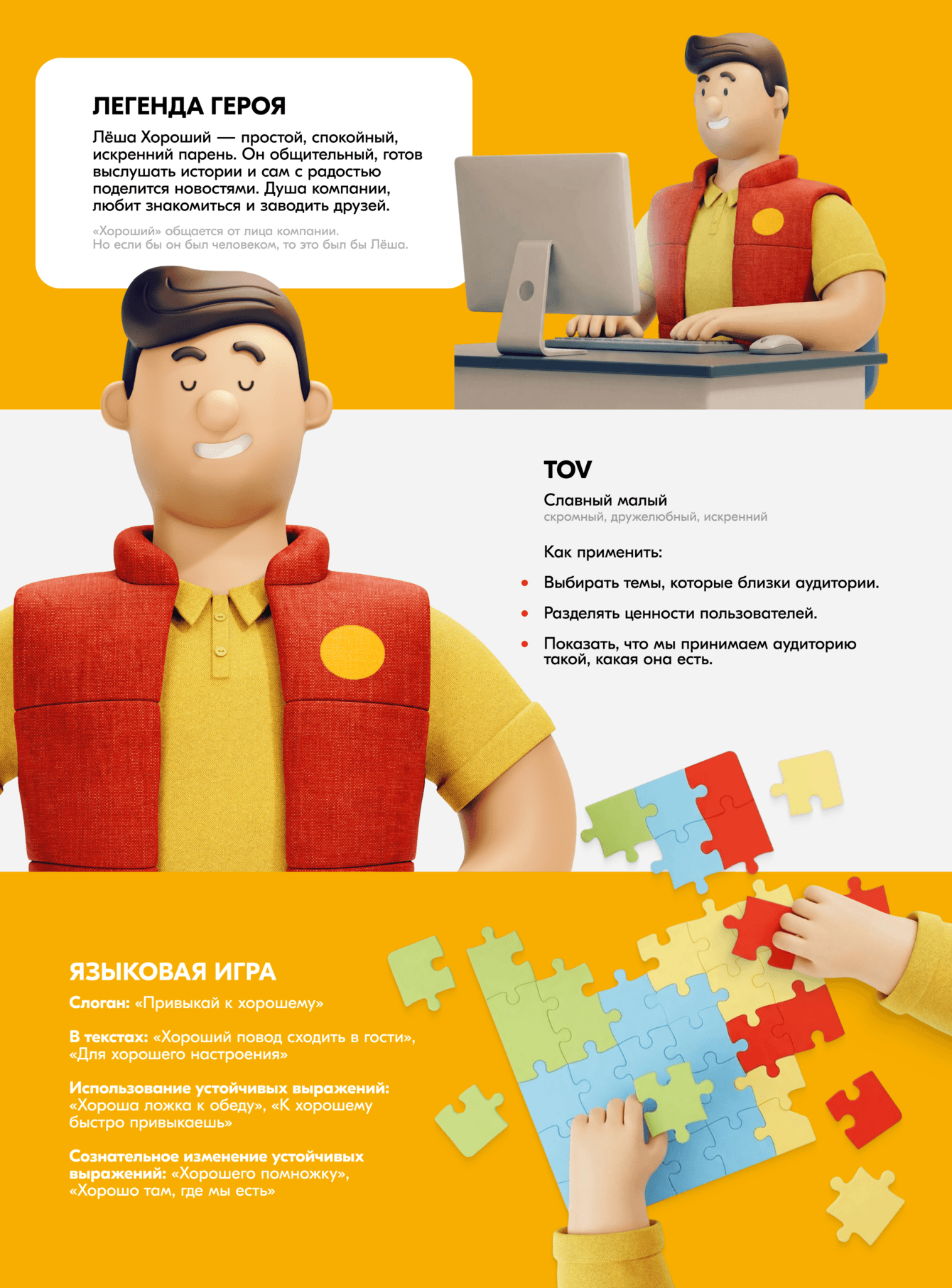 При разработке коммуникационной и смысловой части персонажа мы сформулировали легенду героя и его Tone of Voice, а также прописали языковую игру для большей эмоциональной привязки.