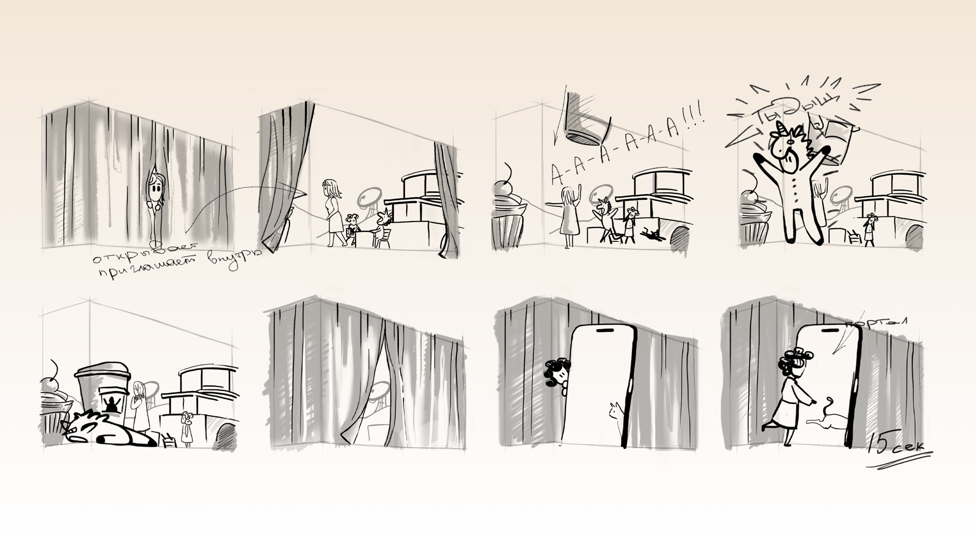 В начале и конце ролика мы использовали занавес. Это классический и простой прием, который эффектно смотрится именно на медиакубе. «Плюс Сити» стал похож на маленькой театр, в котором персонажи игры — приветливые актеры, играющие свои роли.