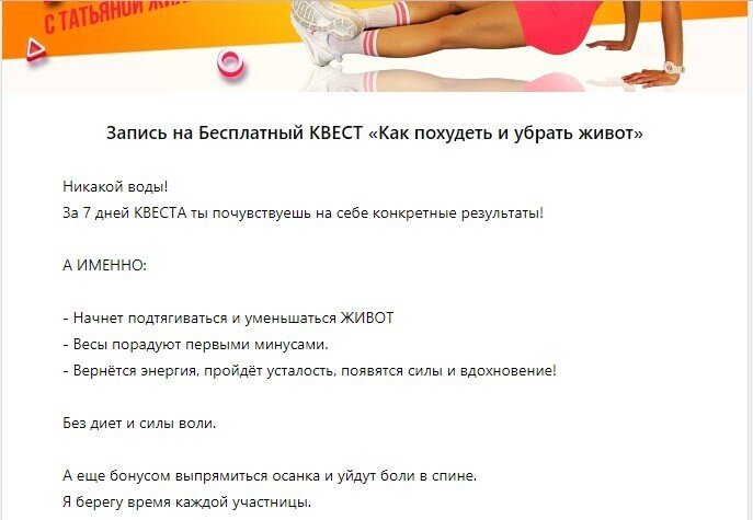За всё время работы трафик мы вели и ведем только на посадочную страницу в Senler с регистрацией на 7-дневный квест: «Как похудеть без жертв и убрать живот». Другой путь трафика мы даже не тестировали. По нашему опыту, для данной ниши и ЦА — это самая лучшая посадочная.