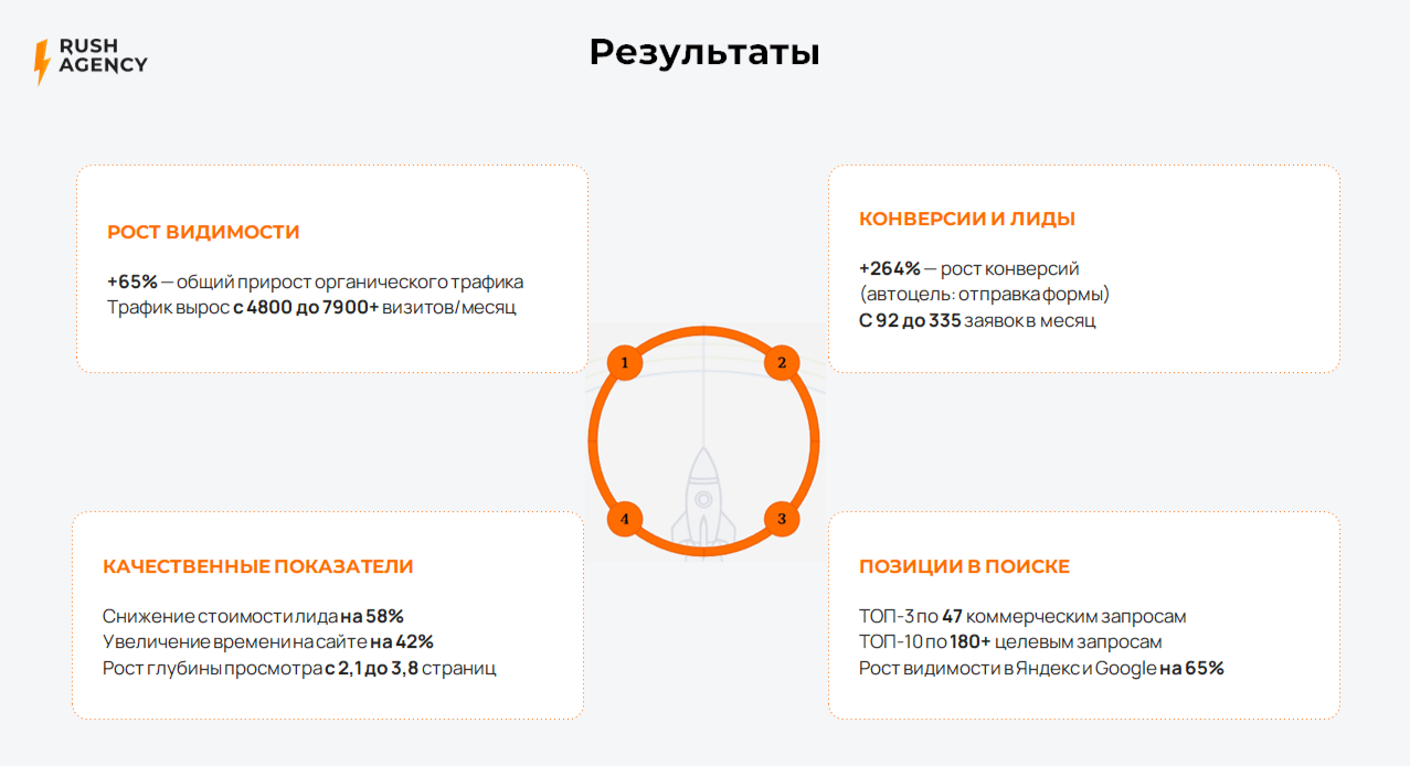 2. Увеличивать поток квалифицированных заявок в >3 раза через комплексную SEO-стратегию.