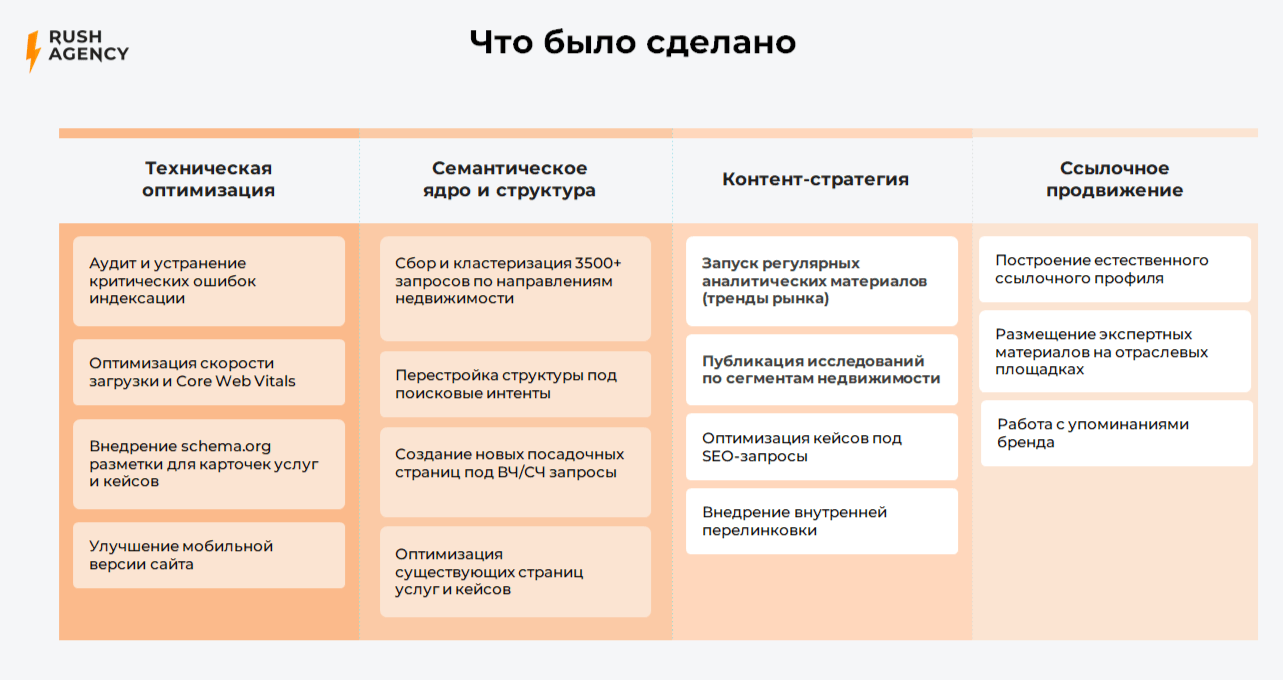 Основная цель: Увеличить поток квалифицированных B2B-лидов через органический поиск в условиях высокой конкуренции на рынке консалтинга недвижимости.