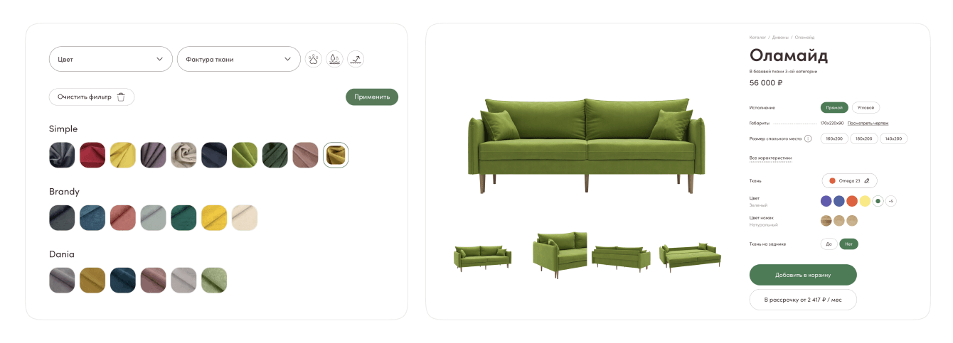 Изначально в каталоге было около 600 вариантов диванов. Многие из них отличались только цветом, размером или типом ткани. Мы решили упростить процесс выбора и заказа, чтобы клиенты не путались в огромном количестве моделей, так появился «конструктор диванов».