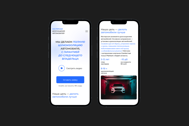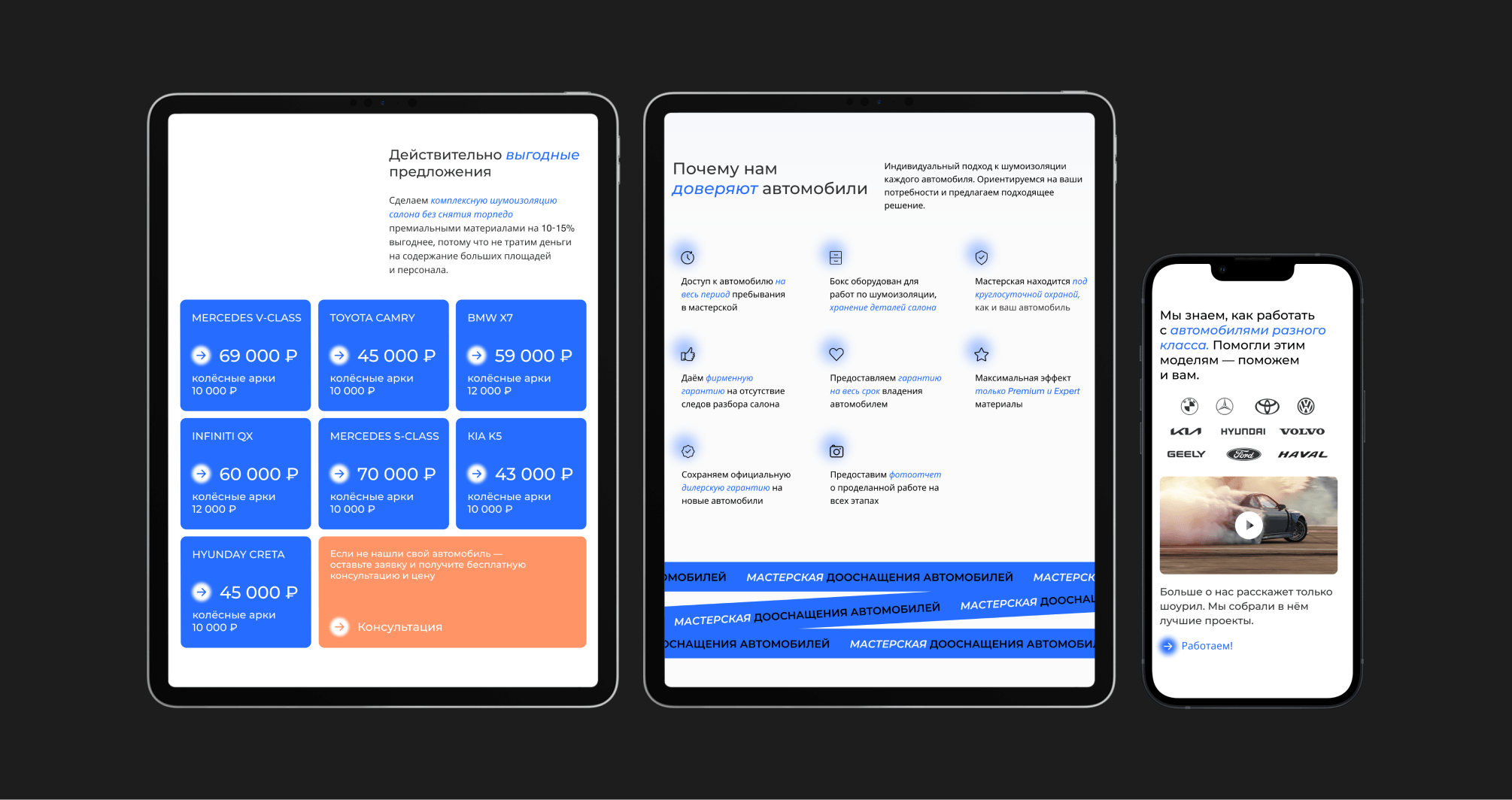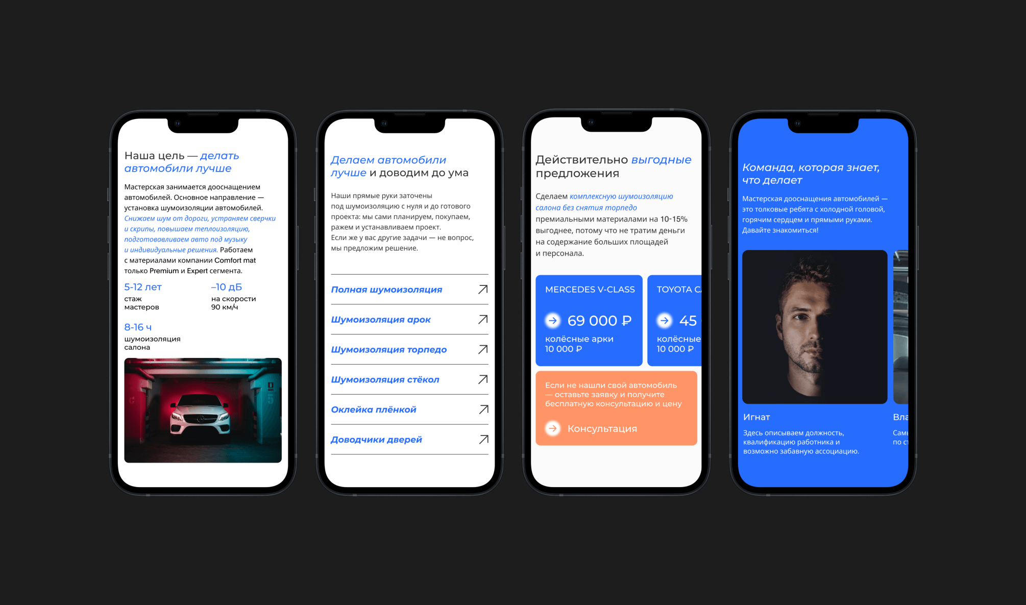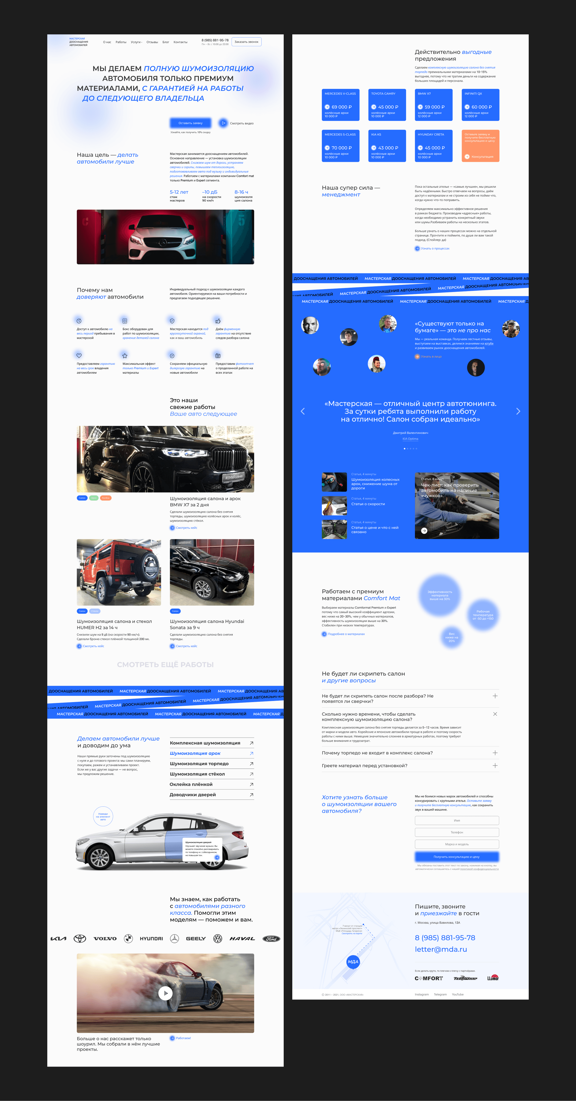 Мастерская дооснащения автомобилей — специализируются на шумоизоляции. Нужно было разработать современный сайт со стильным и минималистичным дизайном, с акцентом на удобство пользователей, включая логичную навигацию и адаптивность под разные устройства, где пользователь может посмотреть все услуги.
