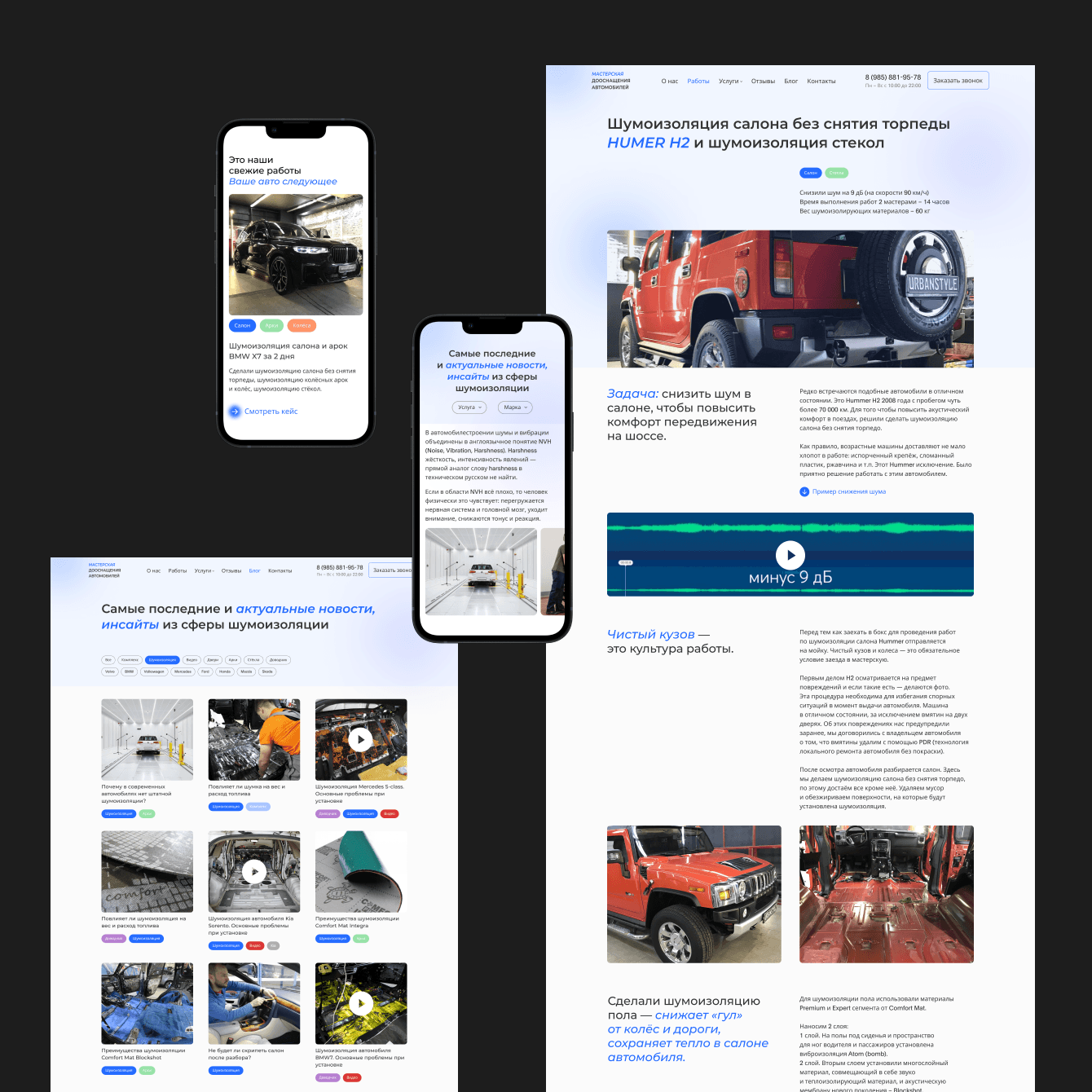 Мы выбрали лаконичный и структурный подход, чтобы сайт выглядел современно и оставался удобным для пользователей. Основное внимание уделили четкой организации информации, сдержанному визуальному стилю и логичной навигации, что позволяет посетителям быстро находить нужные разделы. Поэтому разработали для каждой детали автомобиля отдельную страницу услуги, где показали все преимущества, как ведется работа поэтапно и какие материалы используются, а так же примеры уже готовых работ. Создали такую структуру, которая полезная для пользователя, так как у конкурентов чаще всего было скомканное представление о выгоде для клиента и они не раскрывали суть шумоизоляции.