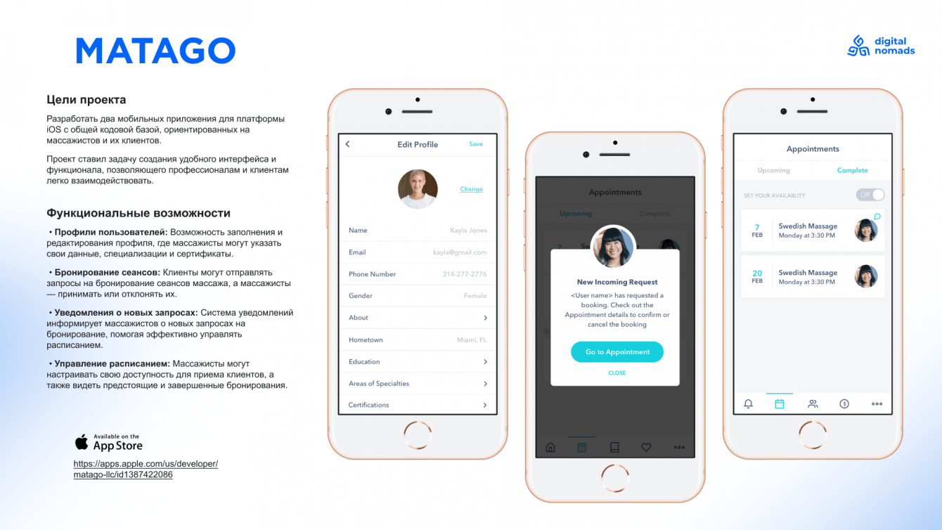Разработать два мобильных приложения для платформы iOS с общей кодовой базой, ориентированных на массажистов и их клиентов. Проект ставил задачу создания удобного интерфейса и функционала, позволяющего профессионалам и клиентам легко взаимодействовать.