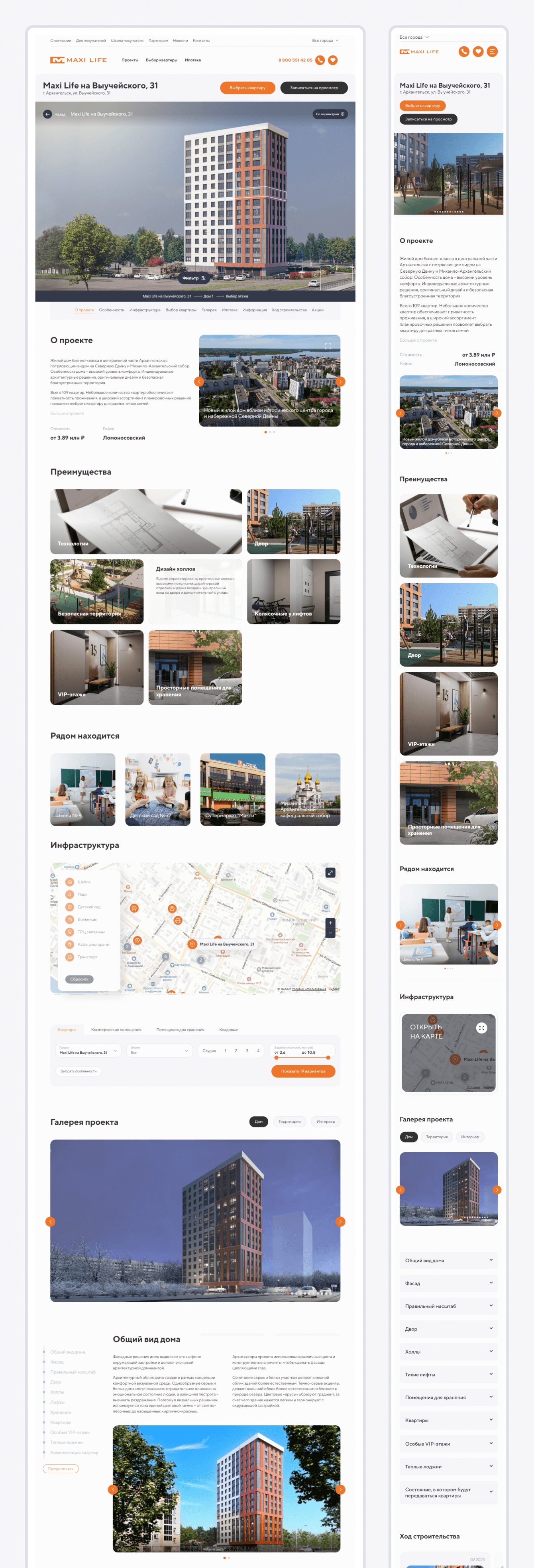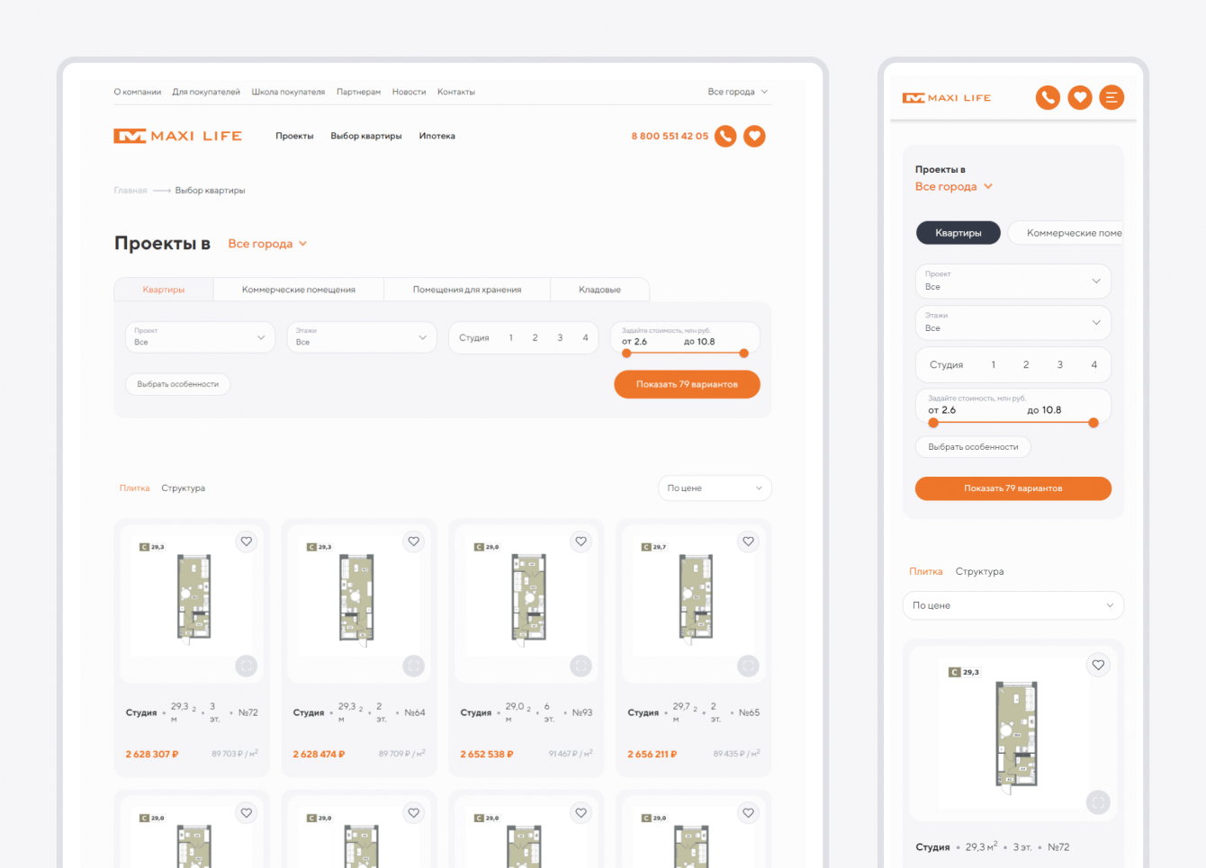 Страницы проектов насыщены информацией, но при этом легко читаются благодаря грамотно распределенному пространству и системе отступов. Мы создали визуальный подбор на 3D плане, который позволяет потенциальным покупателям легко выбрать подходящее помещение.