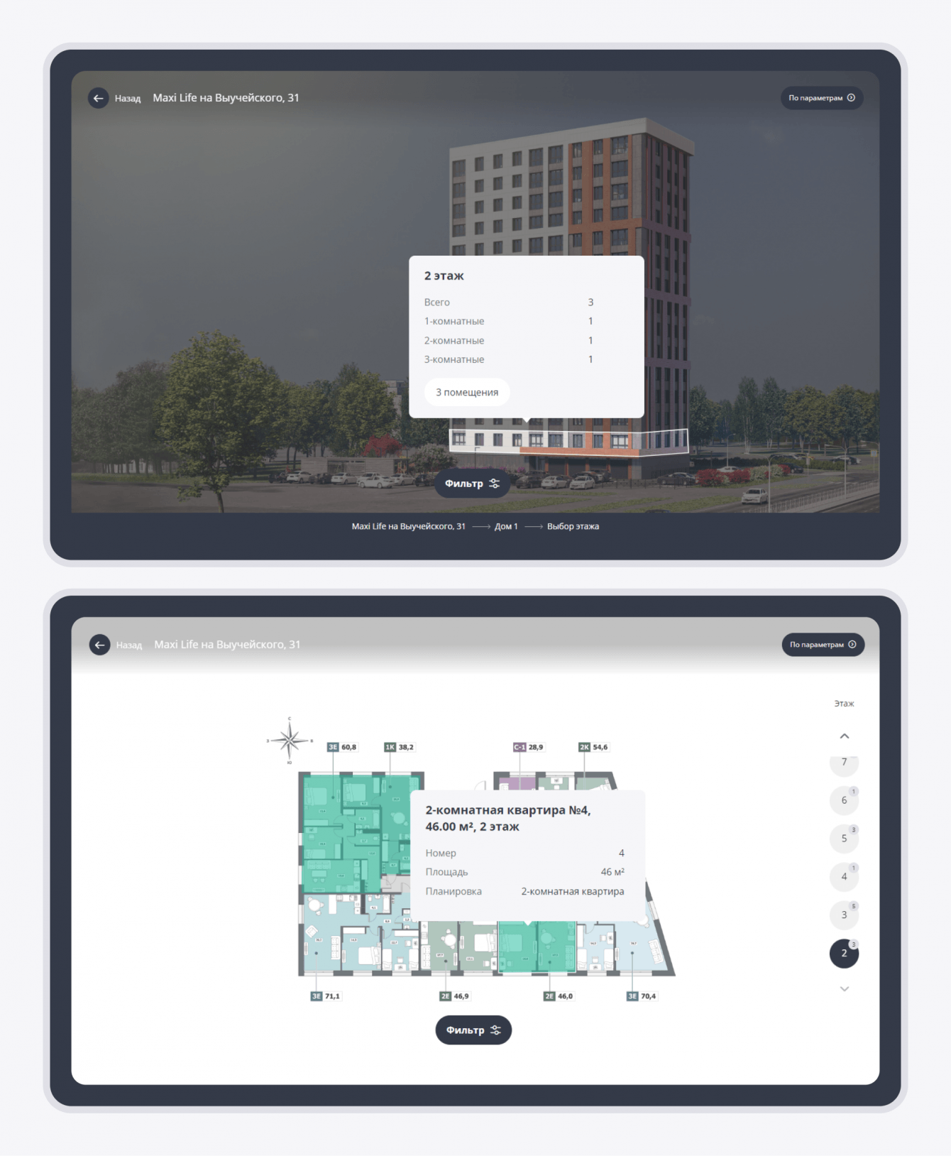 На сайте реализован визуальный подбор квартир на 3D плане. Визуальный выбор может работать как на отдельной странице, так и встраиваться в контент сайта. Решение разработано на vue.js, а на сайте реализован API для обмена данными с этим приложением.