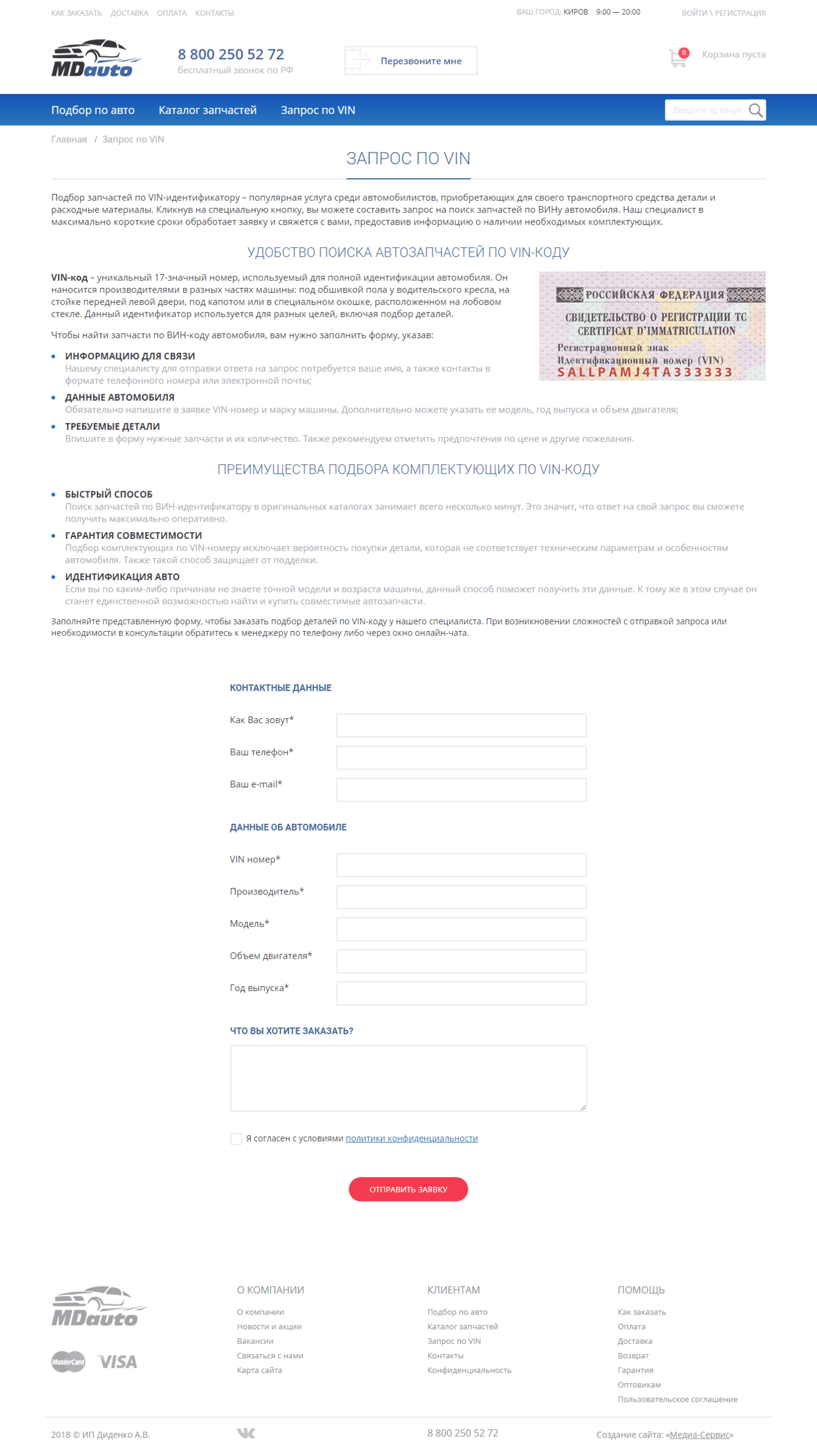 Также реализован поиск запчастей по VIN номеру, артикулу или наименованию.