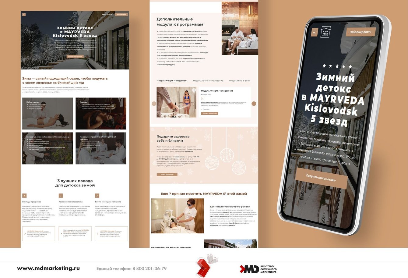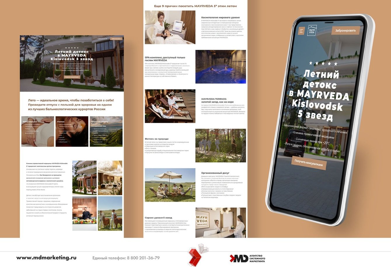 Наш клиент – MediSpa-отель MAYRVEDA Kislovodsk 5 звёзд – санаторий премиум-класса в Кисловодске. Объект реализует абсолютно уникальную для России концепцию: объединяет австрийскую методику Майер-медицины, принципы древнеиндийского учения о жизни — аюрведы — и уникальные локальные природные ресурсы Кавказских Минеральных Вод. Базируется на принципах деликатного очищения организма (детокса) в условиях пятизвездочного сервиса и экологичного дизайна, входит в ассоциацию лучших оздоровительных отелей мира Healing Hotels of the World.