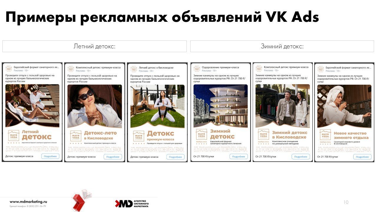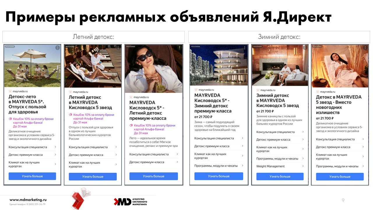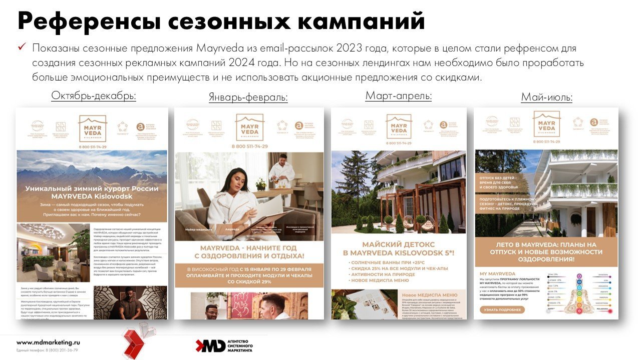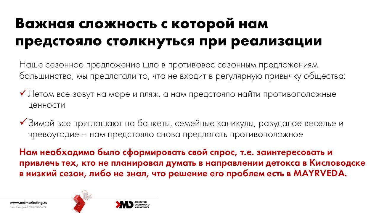 Обычно сезонные предложения компаний приурочиваются к высокому сезону, когда спрос и без того высокий и важно выхватить аудиторию у конкурентов. Нам же предстояло сформировать свой спрос, т.е. заинтересовать и привлечь тех, кто не планировал думать в направлении детокса в Кисловодске в низкий сезон, либо не знал, что решение его проблем есть в MAYRVEDA.