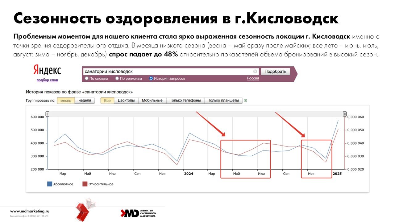 С этой ситуацией можно было смириться, как другие санатории региона, и проживать эти месяцы с низкой загрузкой, либо продавать со скидкой 20%+ и терпеть убытки. Либо предпринять маркетинговые мероприятия для нивелирования влияния сезона.