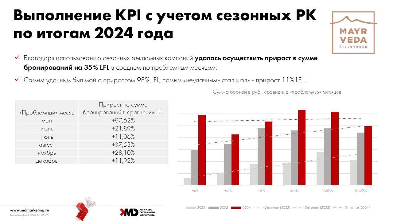 Как поняли уже в процессе продвижения, запускали сезонные предложения мы с опозданием, т.е. аудитория раньше была готова их рассматривать. Каждый год спрос неоднороден, в 2023 году новогодние праздники начали планировать в октябре, а в 2024 году – уже в сентябре. И эту ошибку мы планируем исправить в сезоне 2025 года, повторив сезонные рекламные кампании летом и зимой, и более смело выходить на отдельные рекламные кампании в специфических вопросах – подарочные сертификаты, программы к гендерным праздникам, короткие программы и т.д.