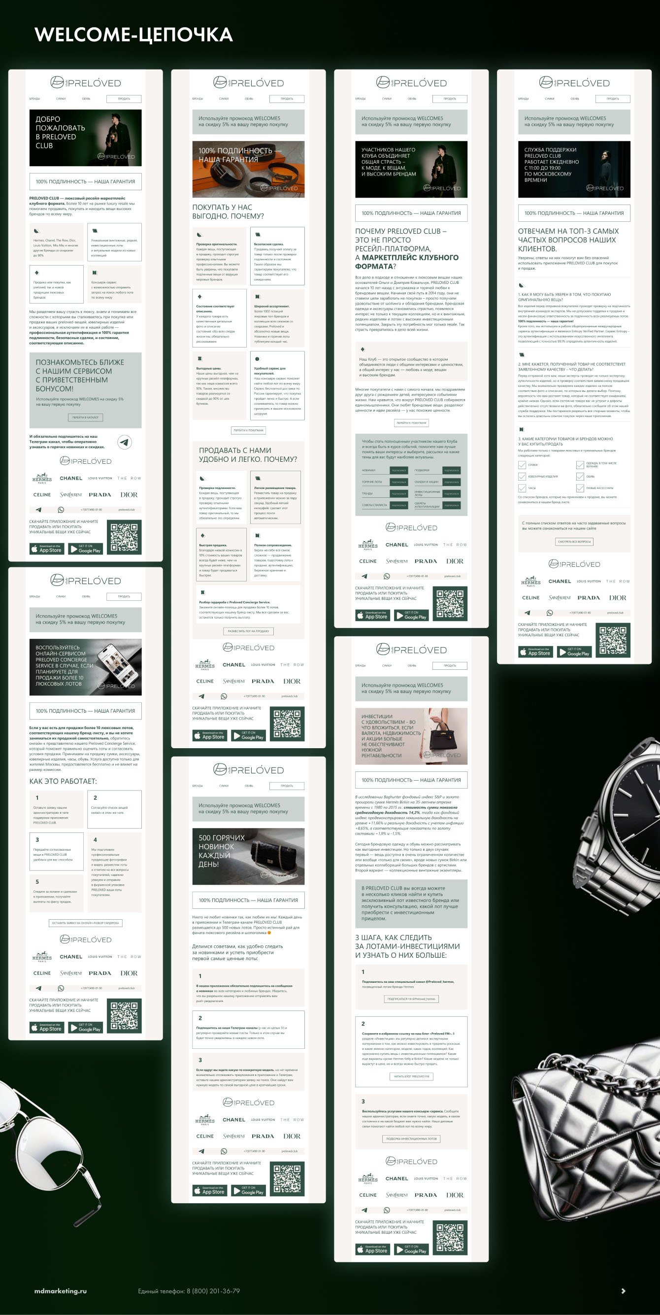 • Email-маркетинг. Разработали и запустили Welcome-воронку из 7 писем. Она знакомила новых подписчиков с философией клуба, преимуществами платформы и подводила к скачиванию будущего приложения. Также утвердили шаблоны для регулярных рассылок (2–3 раза в месяц), которые наполняли контентом и подборками товаров.