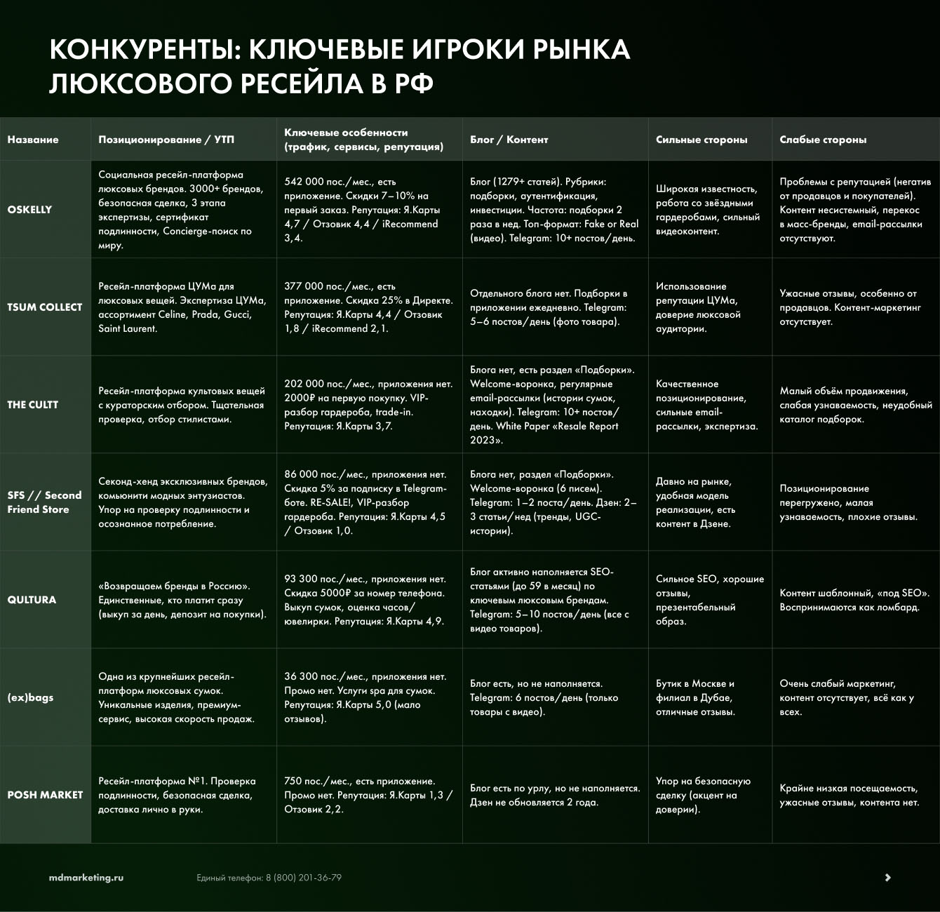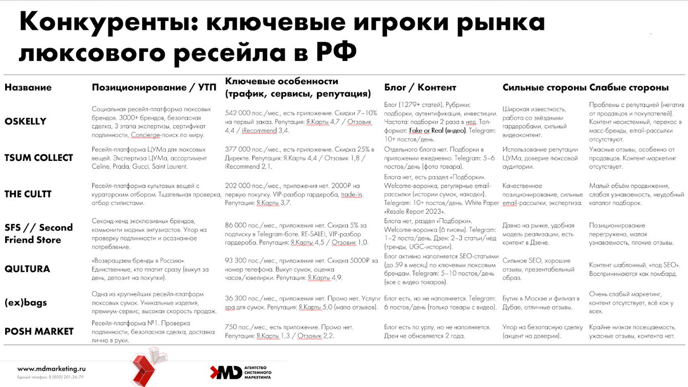Клиент не мог предоставить структурированной информации о конкурентах — только общее представление. Мы взяли эту работу на себя и провели кабинетное исследование 7 ключевых игроков российского ресейла (Oskelly, TSUM Collect, THE CULTT, SFS, QULTURA, (ex)bags, Posh Market) и 6 зарубежных бенчмарков (FASHIONPHILE, The RealReal, Vestiaire Collective, Rebag, ThredUp, Grailed). Анализировали 30 параметров: позиционирование, каналы коммуникации, типы контента, частоту публикаций, вовлечённость, репутацию, уникальные форматы.