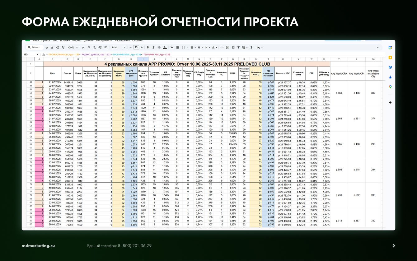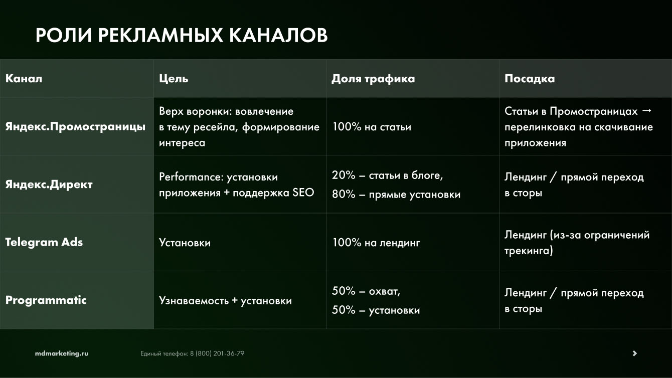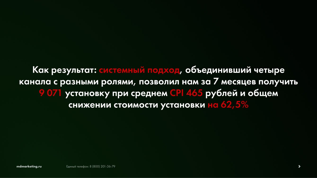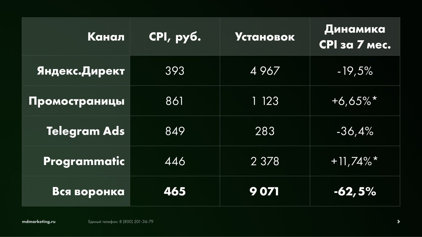 Это позволило нам в режиме реального времени видеть, что работает, а что требует оптимизации, и быстро перераспределять бюджеты в пользу наиболее эффективных каналов.