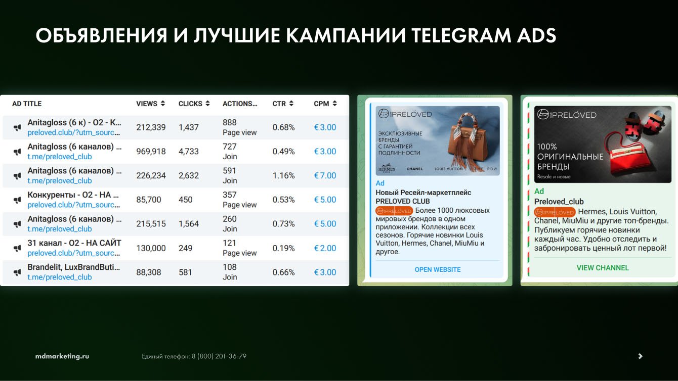 В Telegram Ads нельзя добавить трекинговую ссылку напрямую, поэтому мы вели трафик на лендинг, а уже оттуда пользователь переходил в стор. Это снижало конверсию, но давало возможность работать с высококачественной аудиторией мессенджера. Таргетинг осуществляли на список вручную отобранных каналов в теме ресейла, стилистики, моды.