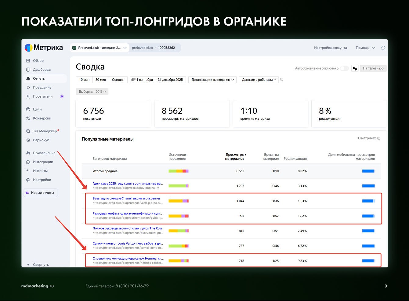 • Органический трафик на сайт вырос с 0 до 1055 посетителей в месяц – исключительно за счет публикации экспертных лонгридов и гайдов. При этом основная доля трафика пришлась на статьи по самым маржинальным для ресейла брендам: Chanel, Hermès, The Row.