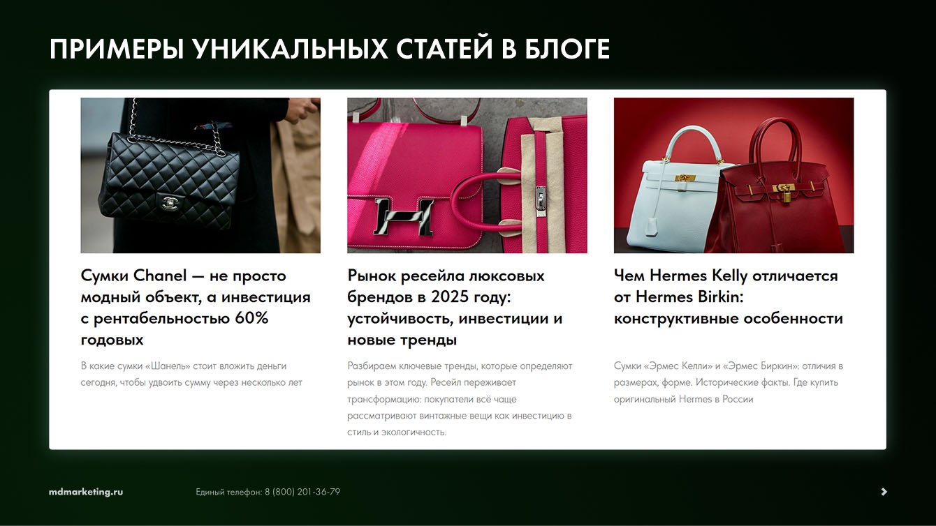 • Создание лонгридов и гайдов. Мы писали сложные, глубокие материалы, опираясь на зарубежные бенчмарки (FASHIONPHILE, The RealReal) и собирая информацию буквально по крупицам. Клиент не мог предоставить готовых данных по аутентификации – мы изучали сайты брендов, профильные форумы, консультировались с экспертами. Так появились статьи, которые впоследствии стали нашим SEO-ядром: