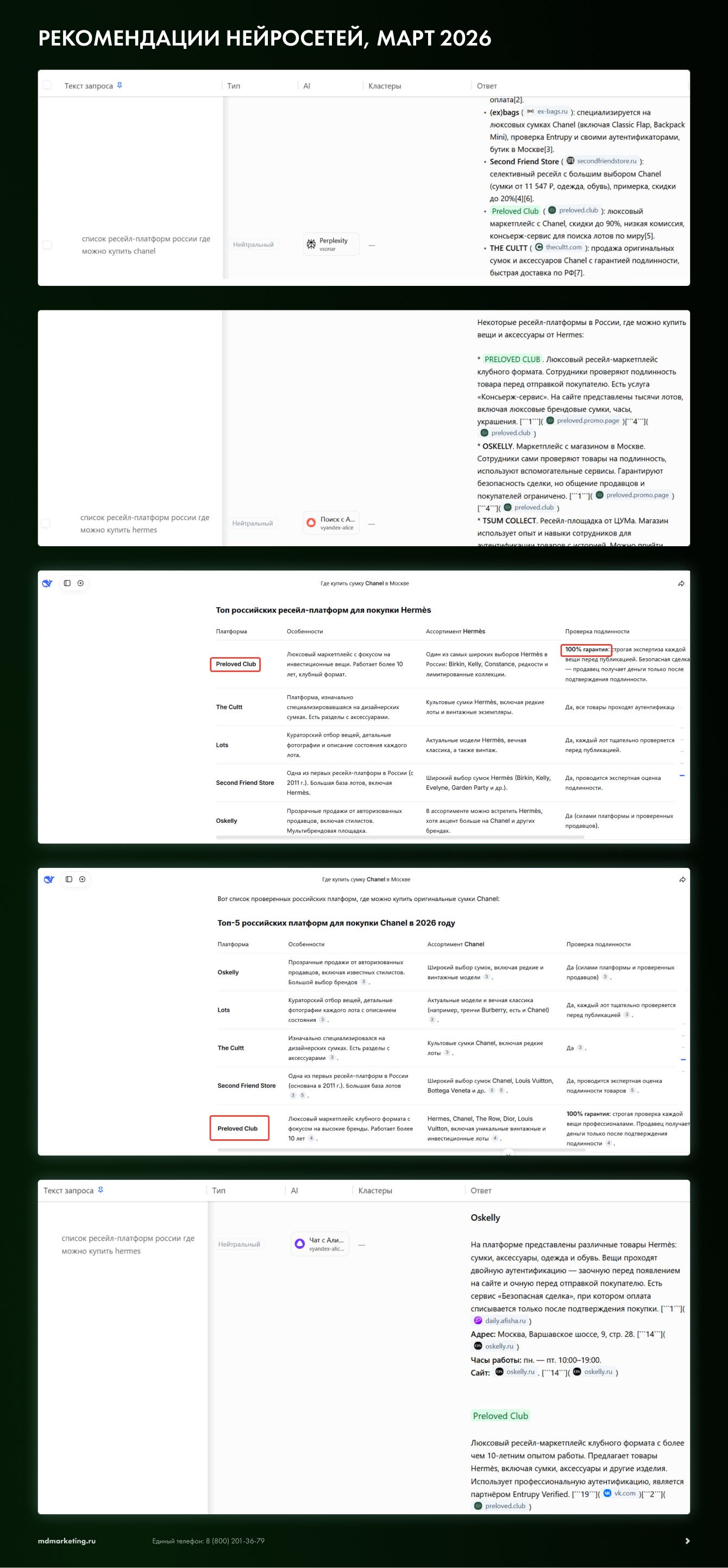 • Выход в топ рекомендаций нейросетей (2026). Это не являлось прямой целью данного проекта, но стало приятным бонусом. Наши материалы оказались настолько качественными и релевантными, что AI-алгоритмы начали рекомендовать Preloved Club как авторитетный источник: