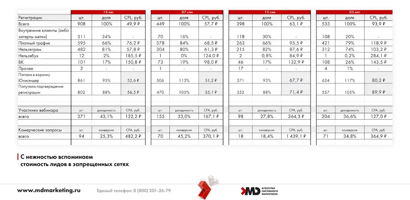 На данном этапе нам нужно было обеспечить максимальный охват аудитории, выполнить план по росту клиентской базы и количеству заявок после вебинаров. Поэтому по каждой премьере и последующих вебинарах мы тщательно отслеживали эффективность.