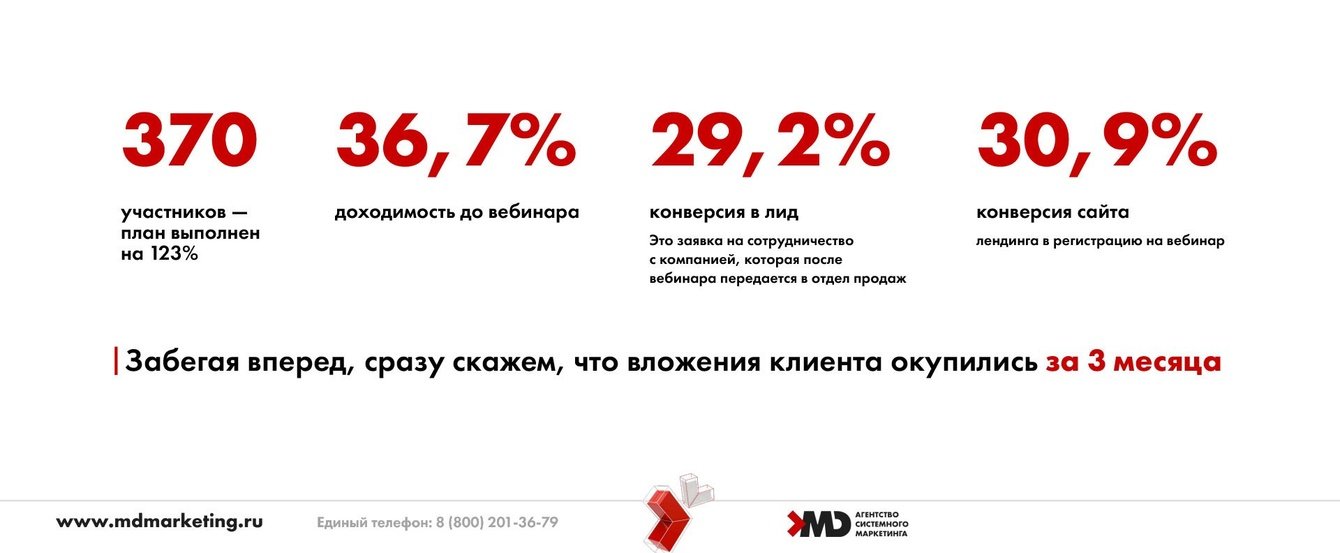 На реализацию Академии под ключ и лендинга для первого мастер-класса у нас ушло 45 дней. Мы провели вебинар, на который смогли привлечь 370 участников. Напомним, что план минимум был 300.
