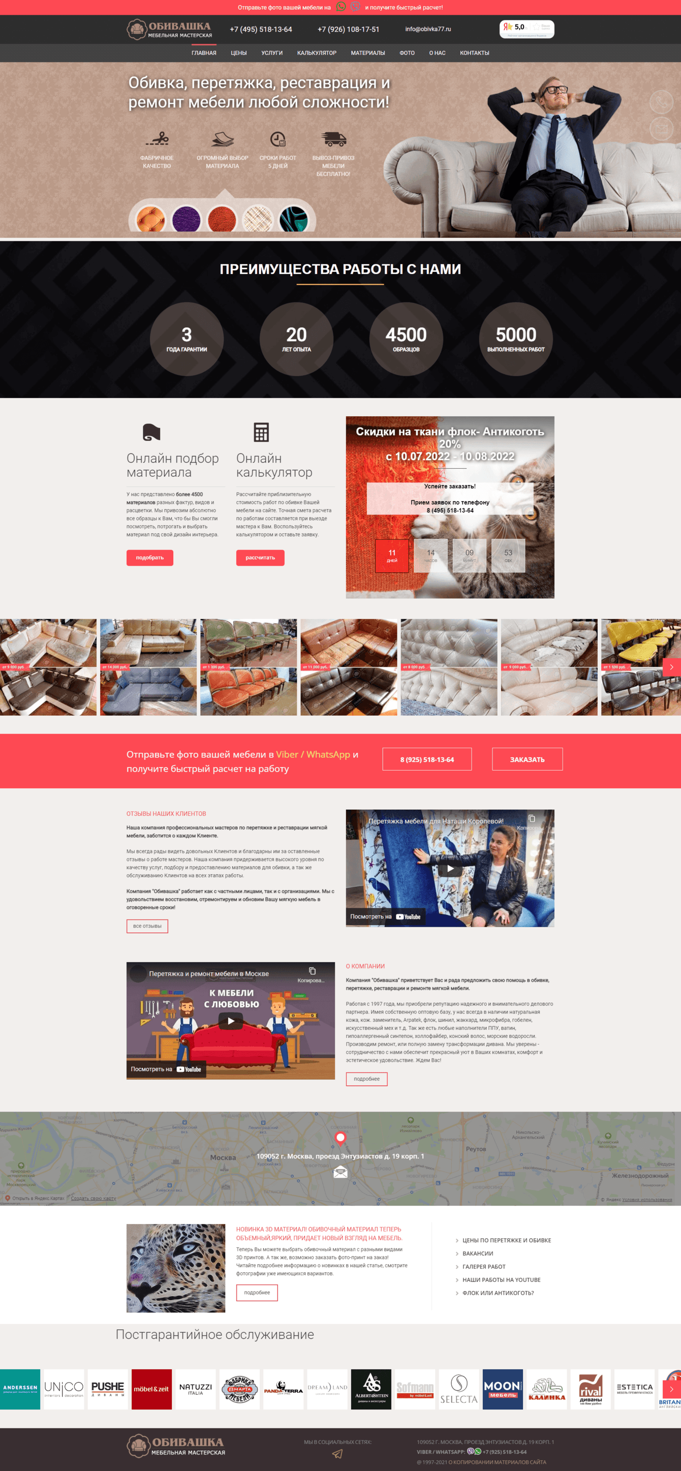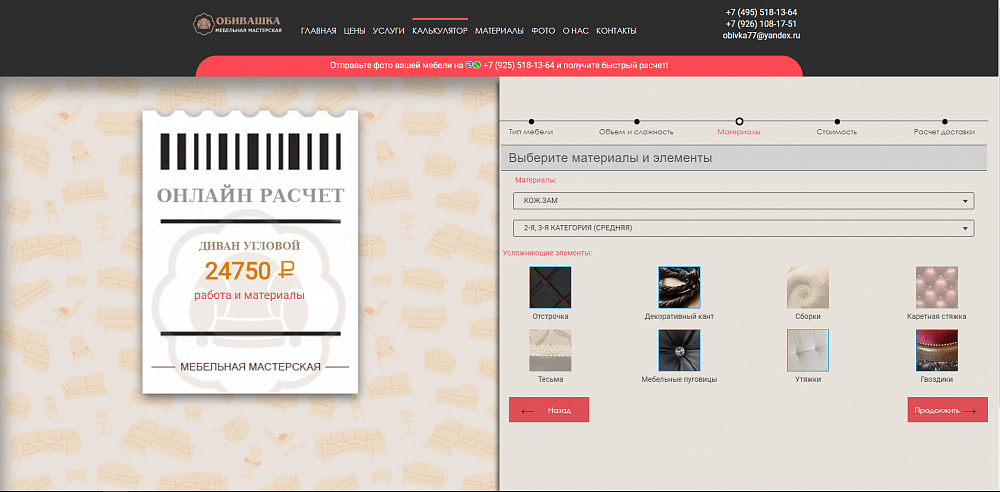 Редизайн сайта под уникальный стиль. Разработать галерею и подбор материалов а так же калькулятор для расчёта стоимости обивки