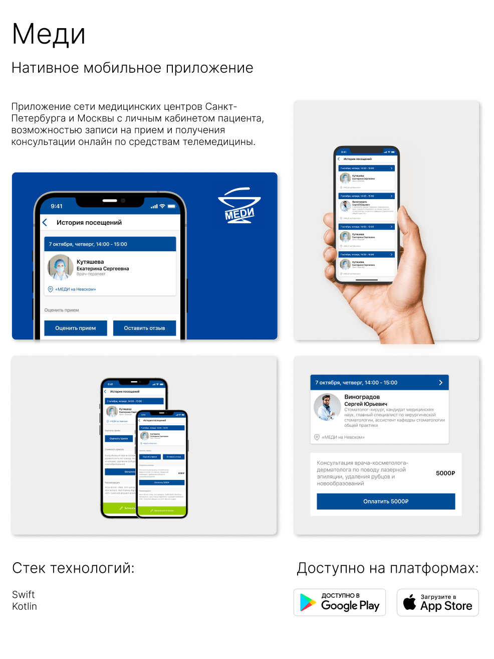 Разработка приложения для сети медицинских центров Санкт-Петербурга и Москвы с личным кабинетом пациента, возможностью записи на прием и получения консультации онлайн по средствам телемедицины.