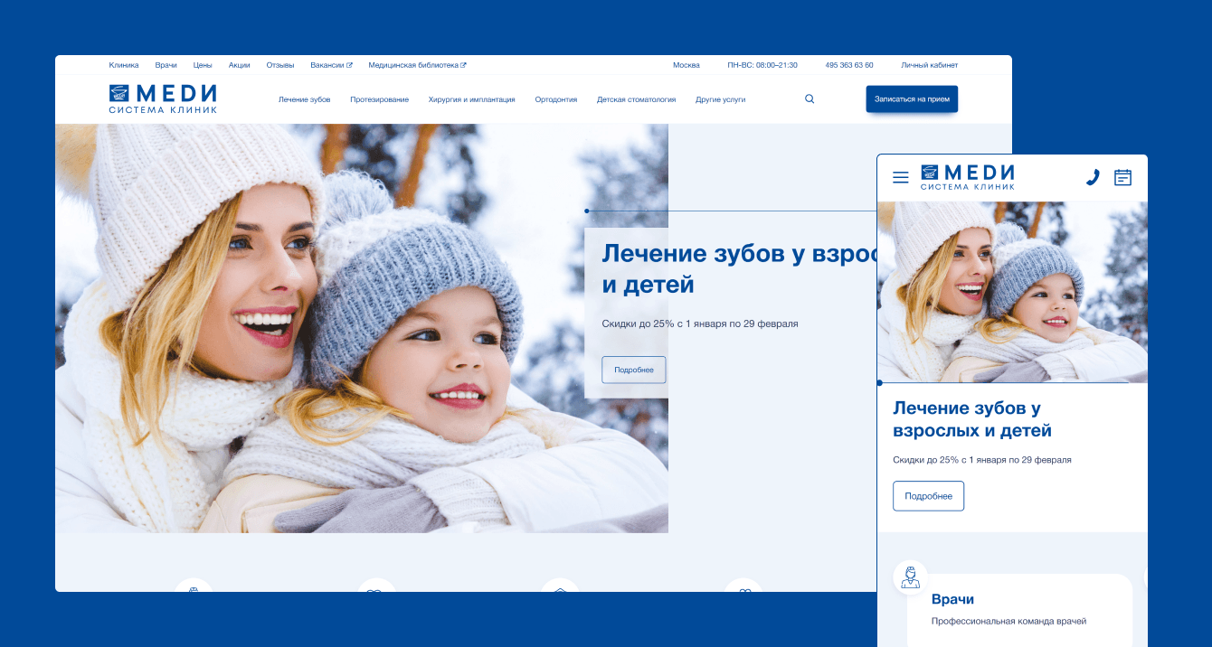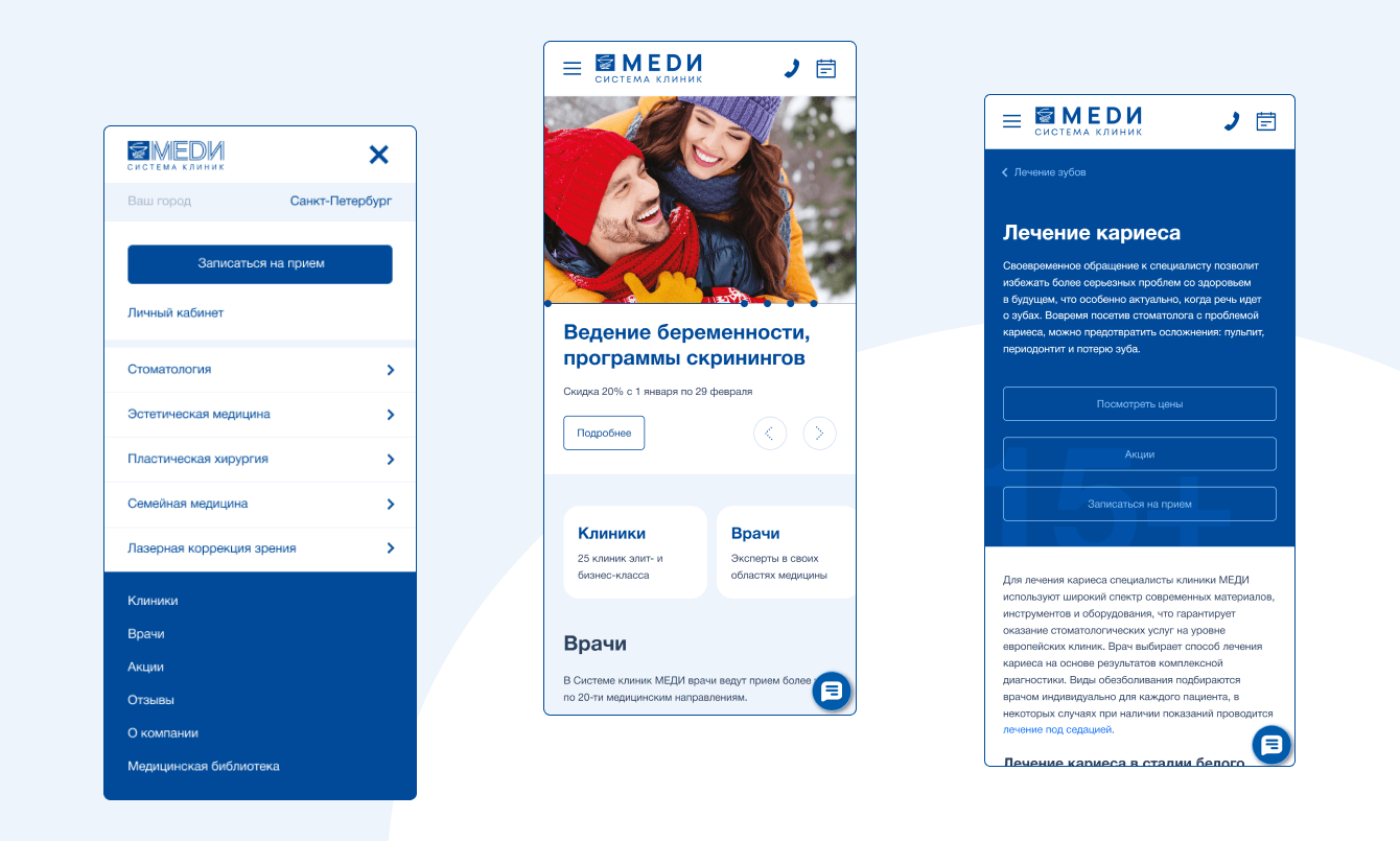 Для аудитории не знакомой преимуществами сети клиник «Меди» на сайте созданы разделы с детальной информацией об услугах, работающих специалистах, отзывы, исчерпывающая информация о структуре и истории компании.