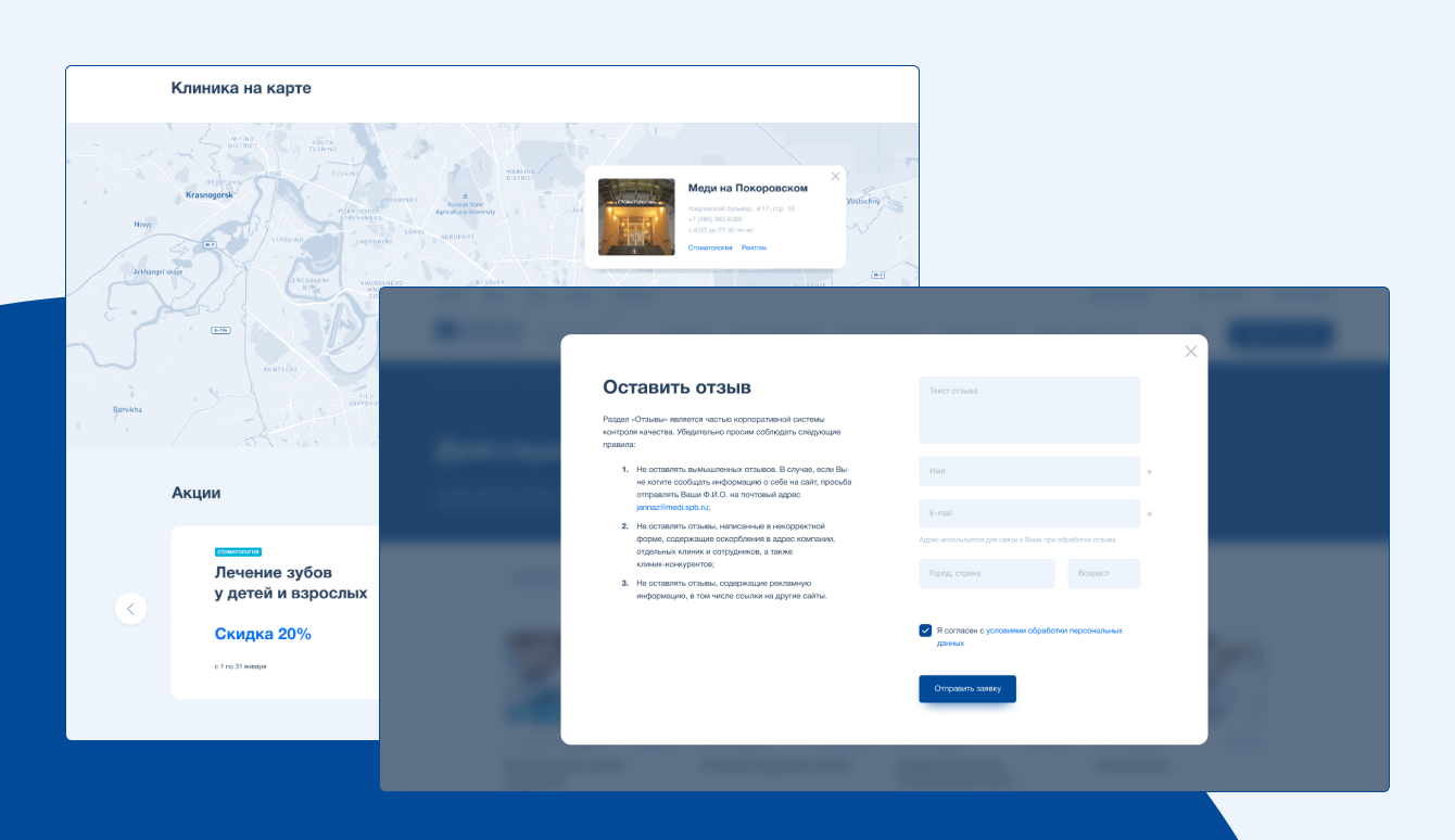 Нашей задачей стало разработать корпоративный сайт как инструмент для подбора специалиста и запись на приеём в одну из клиник.