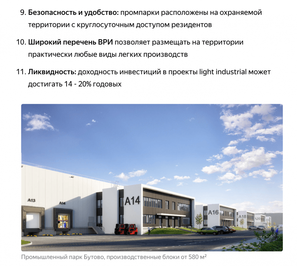 Отдельно выделили цели, для которых можно использовать помещения, и рассказали про виды производств. Поскольку большая часть парков находилась на стадии строительства, мы размещали в статьях рендеры с визуализацией, как эти помещения будут выглядеть. На рендерах показывали как внешний вид зданий, так и интерьер, расположение склада, офиса, производства.