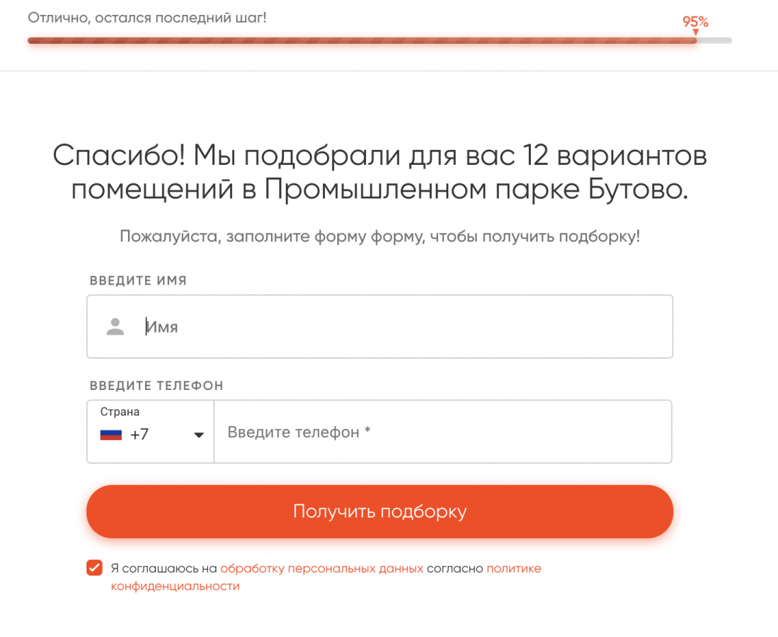 В конце квиза мы запрашивали у пользователей имя и телефон, а затем связывались с ними и отправляли персональную подборку помещений:
