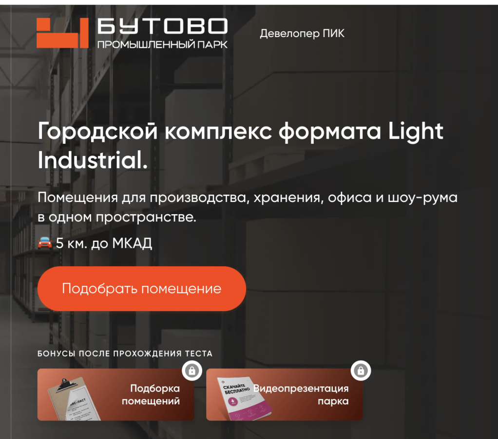Мы решили протестировать «ПромоСтраницы» — brandformance-инструмент от «Яндекса», который помог бы подробно рассказать о таком сложном и дорогом продукте, как коммерческая недвижимость в индустриальном (производственном) сегменте, описать его преимущества и прогреть аудиторию. Стоимость такого размещения относительно невысокая: чтобы получить первые результаты через месяц, стартовый бюджет компании должен быть не менее 1,2 тыс. руб. с НДС в день.