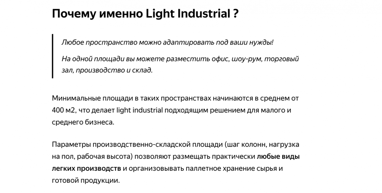 В контенте мы учли УТП клиента, например, при составлении текста подробно описали все преимущества промышленных парков и сделали на них акцент в статье, показали расположение промышленных парков.