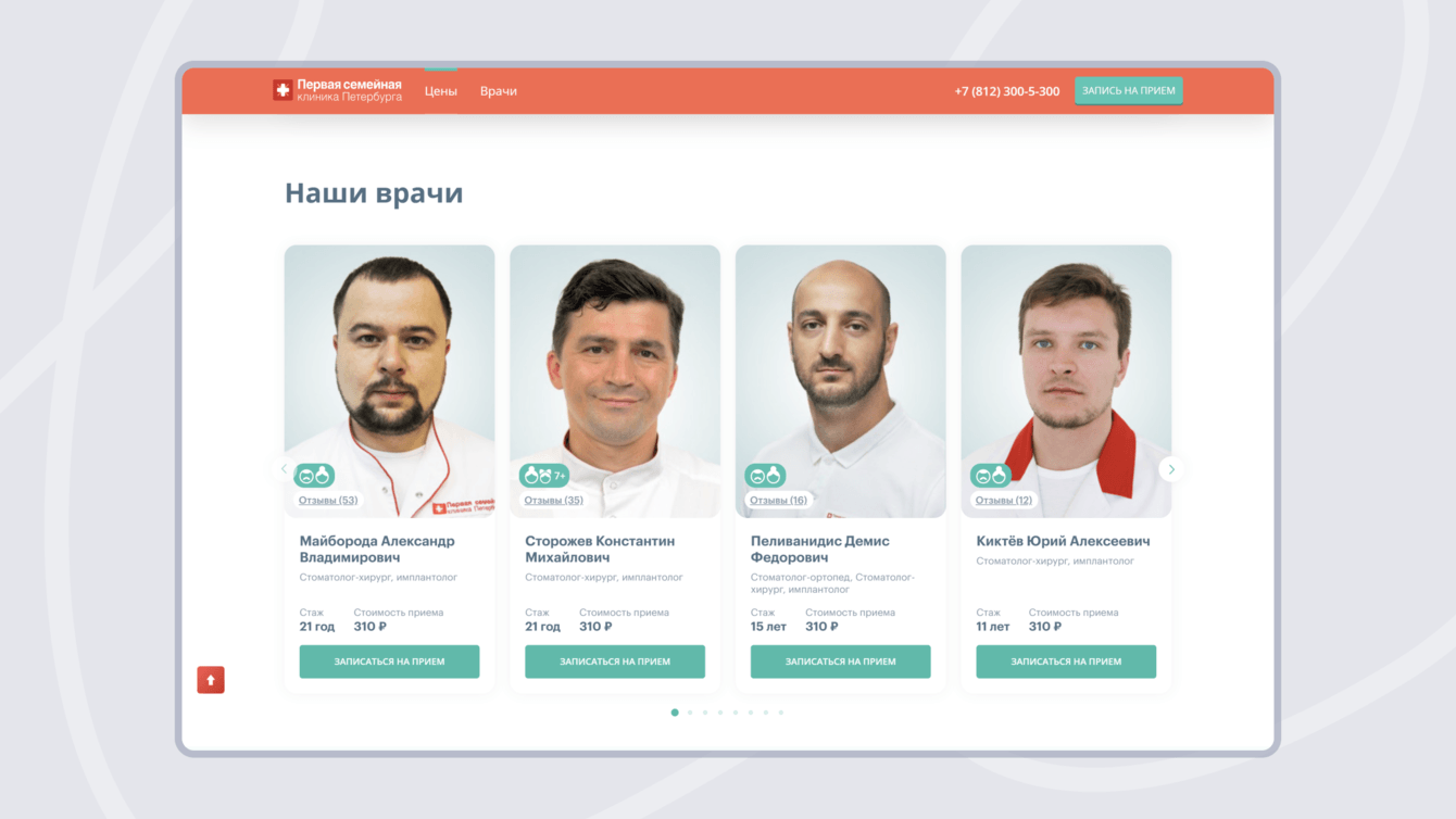 Для развития функциональности сайта и решения задачи по увеличению трафика с конвертацией заявок интегрировали сайт с фидами Яндекс.Директ. Создали файлы самой организации и карточки врачей, которые обеспечивают актуальность контента на всех страницах и агрегаторах услуг. Такой функционал позволяет пользователям в реальном времени видеть доступное время врачей с ценами.