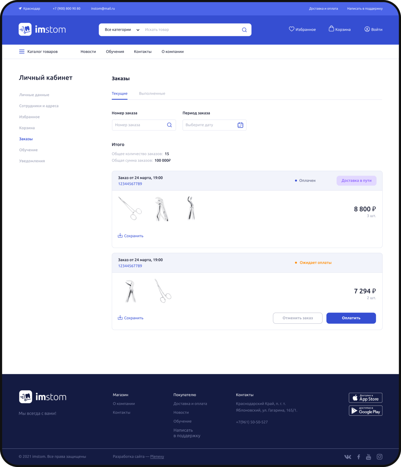 В разделе «Заказы» можно отфильтровать заказы нажатием на «Текущие» или «Выполненные», найти заказ через поиск по номеру или периоду заказа. Посмотреть общее количество заказов и общую сумму заказов. У заказов предусмотрены статусы — например, «Оплачен», «Ожидает оплаты», «Доставка в пути».