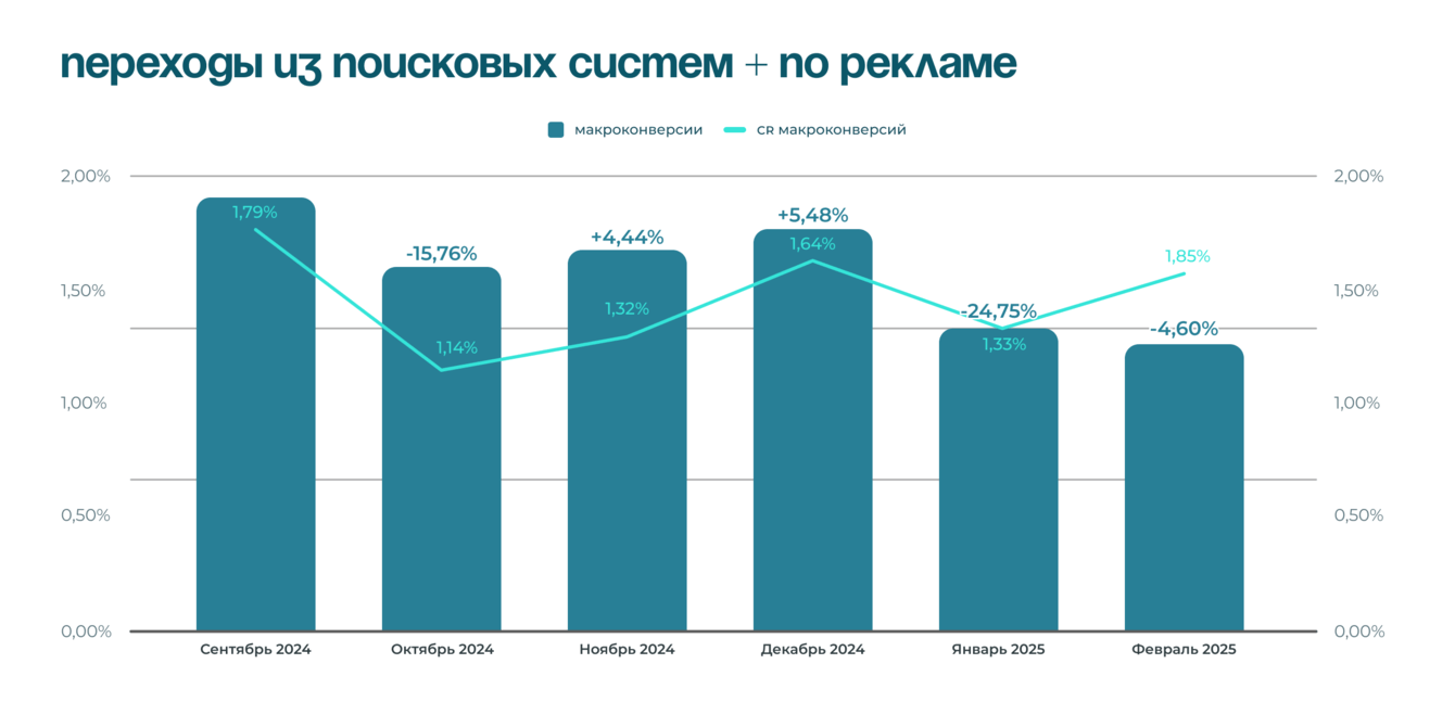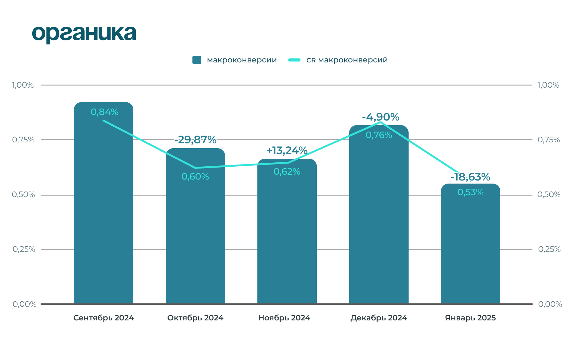 Долгосрочная динамика (сентябрь 2024 - февраль 2025 года). Заметно продолжение негативного тренда по оплатам. Однако в декабре медийная реклама не только обеспечила явный прирост по сравнению с ноябрем, но и, вероятно, компенсировала потенциальное снижение макроконверсий, которое могло произойти без этого канала.