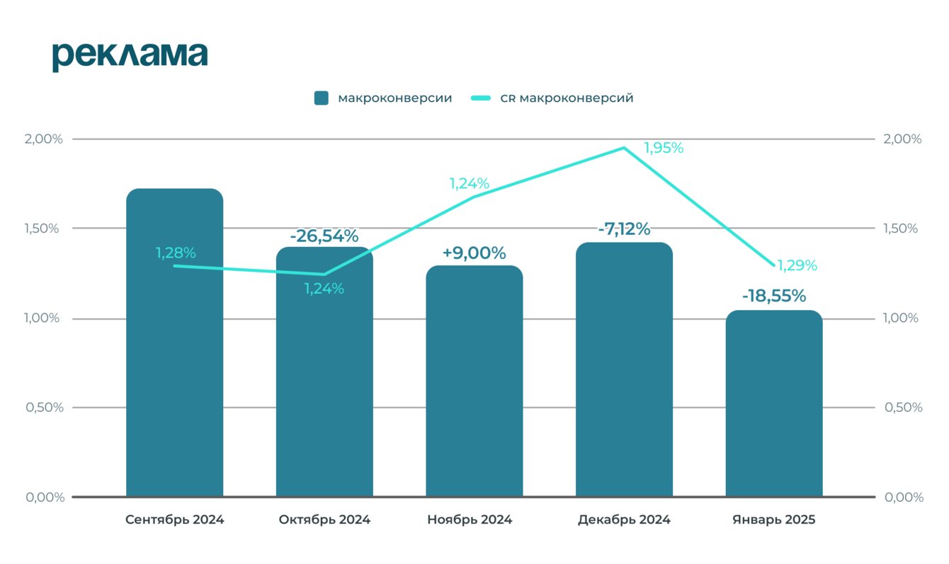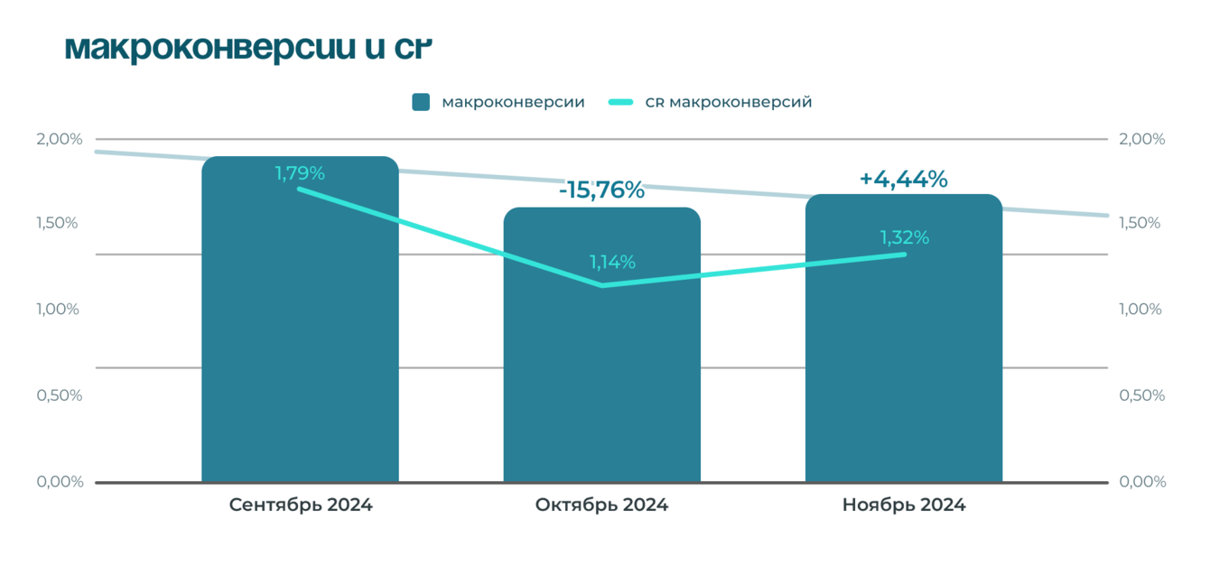 Реклама. Средний CR по макроконверсиям увеличился на 15%, а общее количество оплат выросло в среднем на 9% при сравнении ноября – декабря 2024.