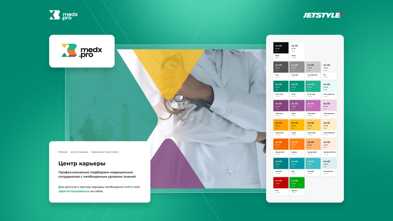 Из элементов фирменного стиля у MedX.pro был только логотип. Перед тем, как приступить к редизайну, на основе элементов и цветовой гаммы логотипа мы создали несколько вариантов визуальной айдентики бренда. Заказчики выбрали вариант с использованием графического символа лого (стилизованной буквы Х), и на его основе мы оформили все страницы сайта и собрали UI-кит из элементов дизайна. Также мы создали мобильную версию сайта, которой раньше не было.