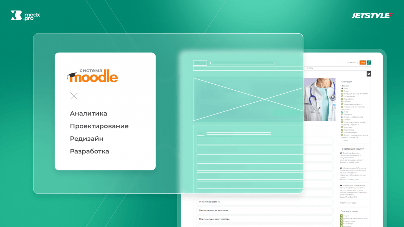 Обучение программам MedX.pro проходит в системе Moodle, на ней же базировался и информационный сайт центра. Из-за шаблонного оформления, в котором не были продуманы пользовательские сценарии, сайт был не продающим, к тому же выглядел устаревшим. Поэтому заказчики обратились к нам за новым дизайном и разработкой отдельного сайта-витрины, в том числе его мобильной версии.