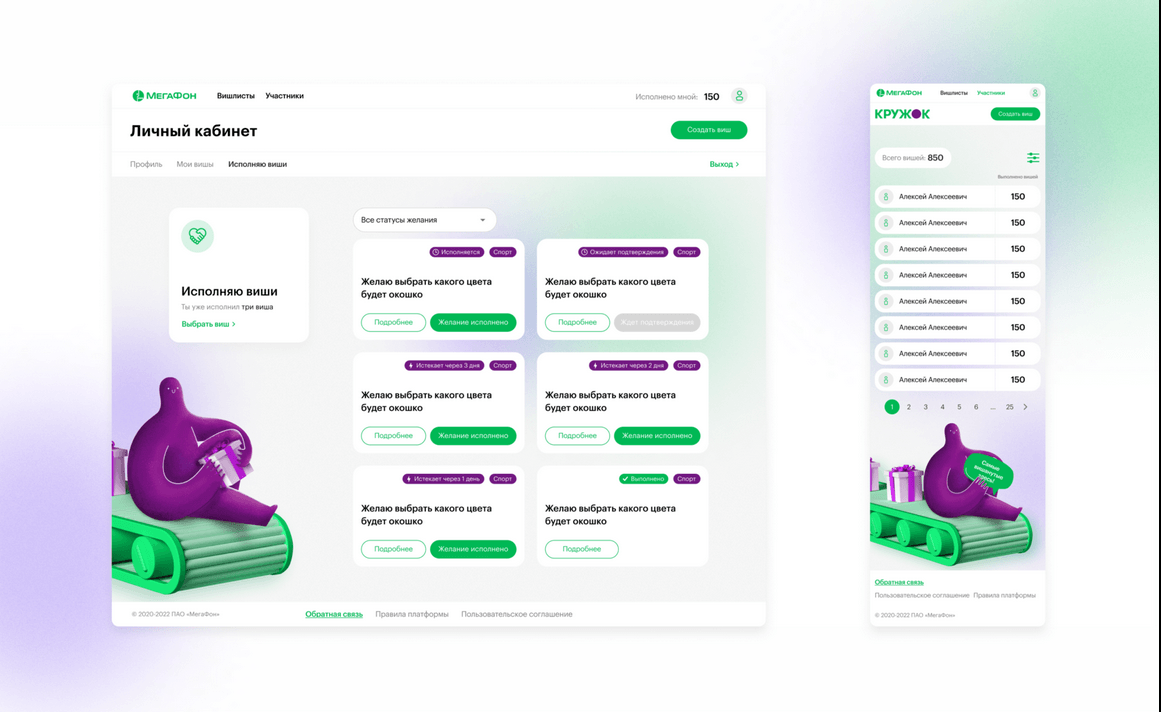 Проект для сотрудников Мегафона, суть которого в выполнении желаний своих коллег. Мы взялись за данный проект только со стороны бэкенда, закрыли MVP за 5 недель, а далее в течение 6-ти недель производилось расширение функционала. Проект был выполнен с нуля до продакшена, в том числе был пройден внутренний аудит безопасности Мегафона перед тем, как они забрали данное приложение под свое крыло.