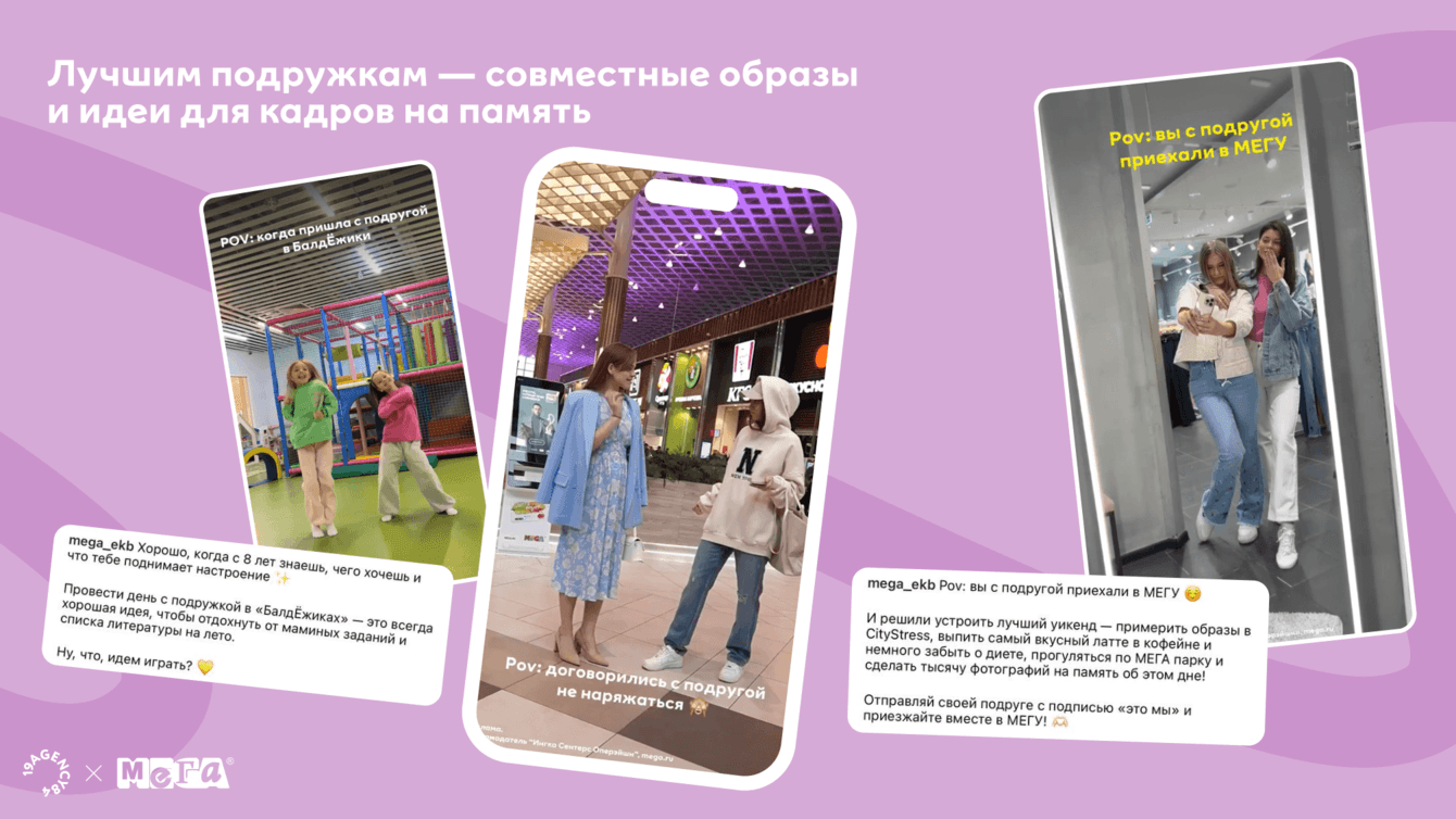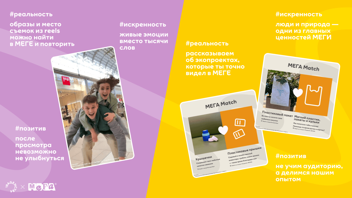 При всём этом бережно сохраняя идентичность МЕГИ, ее характер и ценности. Мы стали качать соцсети, но так, чтобы за хайповым контентом не потерялась МЕГА. МЕГА как она есть: дружелюбная и игривая, искренняя и сопереживающая, заботящаяся о людях и планете.