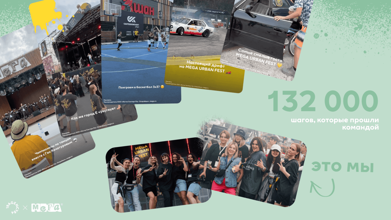 Работа с МЕГОЙ — это 60 публикаций в месяц, 2500 кадров в неделю, 20000 шагов на каждом ивенте. Именно этот драйв и темп, который нам удается поддерживать и наращивать вместе с клиентом, дает видимый результат в качественных и количественных метриках.