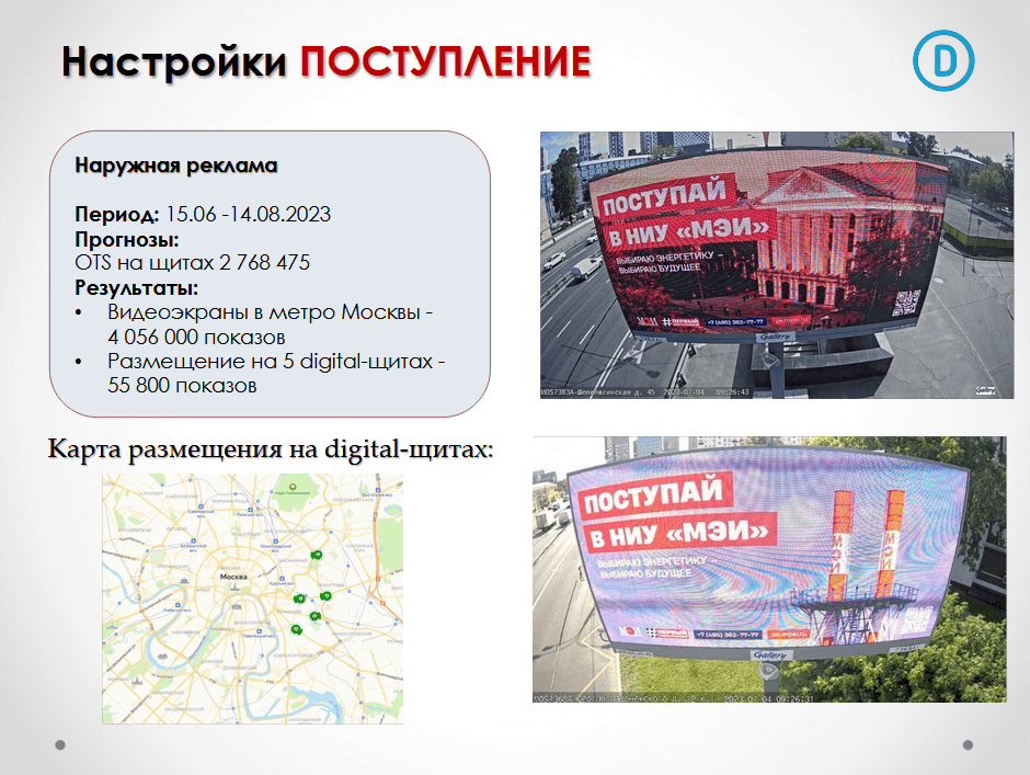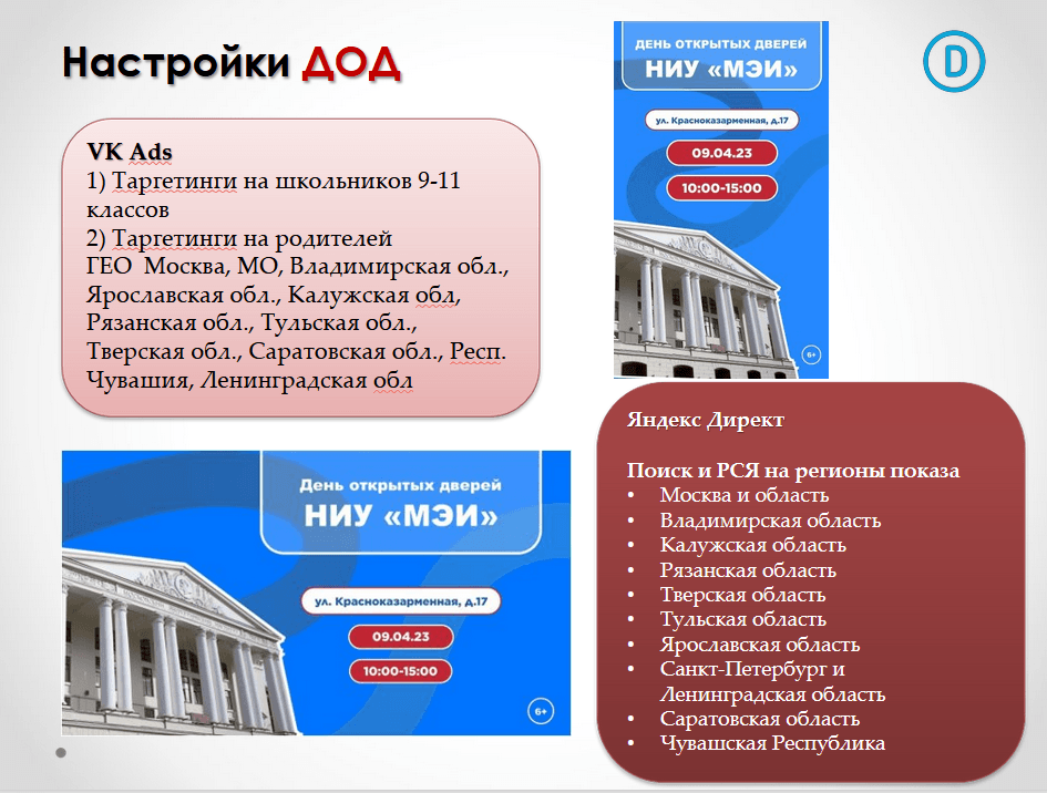 Для продвижения Дня открытых дверей была запущена таргетированная реклама в VK Ads и Яндекс Директ. В VK Ads настраивались кампании отдельно на школьников 9–11 классов и на их родителей, с охватом Москвы, Московской области и ближайших регионов. В Яндекс Директ использовались поиск и РСЯ, чтобы дополнительно охватить ту же географию и привлечь внимание как абитуриентов, так и их семей. Такой подход позволил охватить ключевую аудиторию и увеличить вероятность принятия решения о посещении мероприятия.